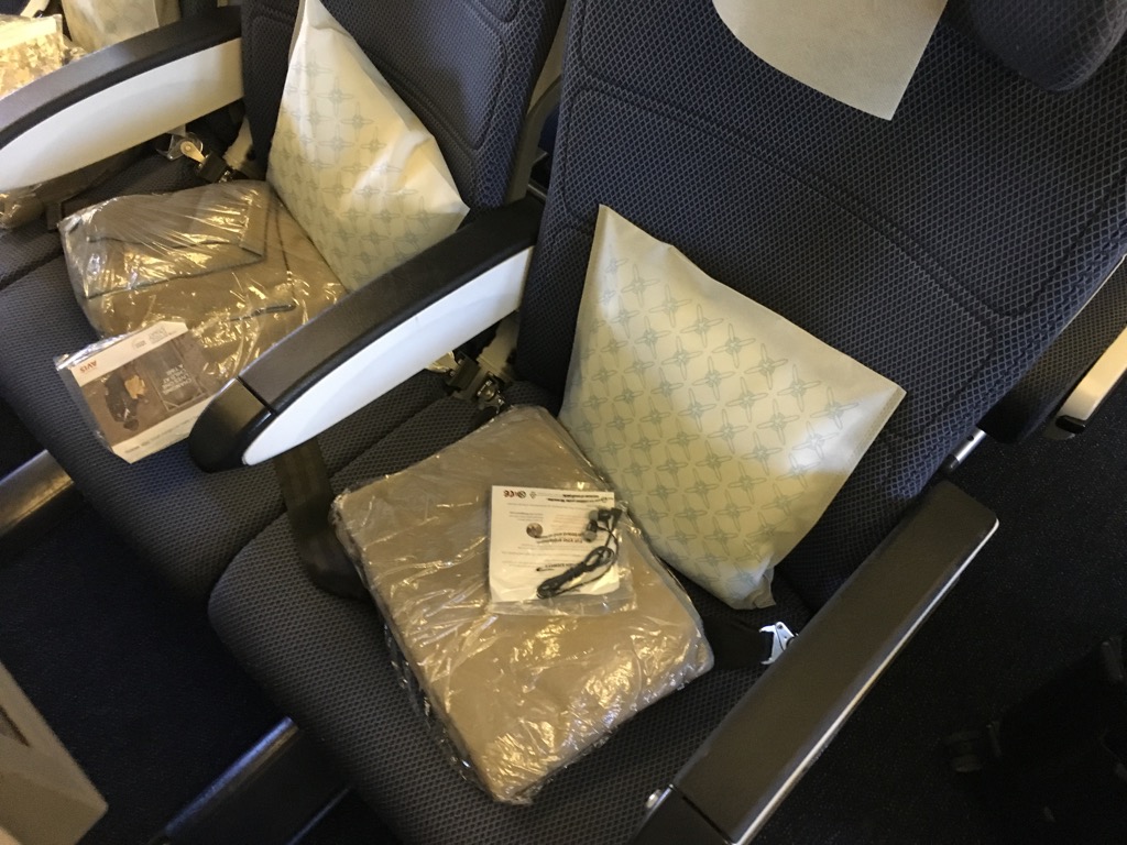 Auf allen Sitzen befand sich bereits eine Decke und ein Kissen. Beide waren für eine Economy Class von durchaus guter Qualität.