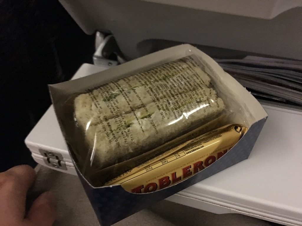 Dieser wurde nur zwei Stunden nach dem ersten großen Service begonnen und bestand aus einer weiteren Getränkerunde und einem Sandwich plus Schokoriegel. Diesen zweiten Service hätte man bei diesem kurzen Flug wohl nicht mehr gebraucht und eine letzte Getränkerunde hätte es auch getan. Ich war zumindest zu diesem Zeitpunkt noch nicht wieder hungrig.