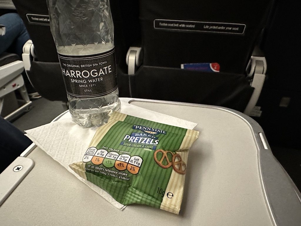 Alle Passagiere der Economy Class erhielten eine Flasche Wasser und einen salzigen Snack, dann wurde die Beleuchtung auf ein angenehmes Blau verdunkelt.