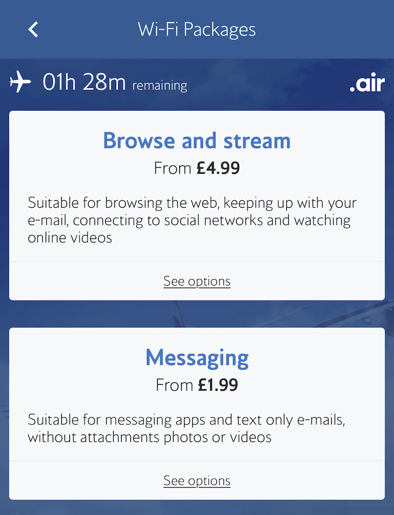 Passagiere können sich in diesem Fall auch im Internet einwählen, es gibt zwei kostenpflichtige Pakete.