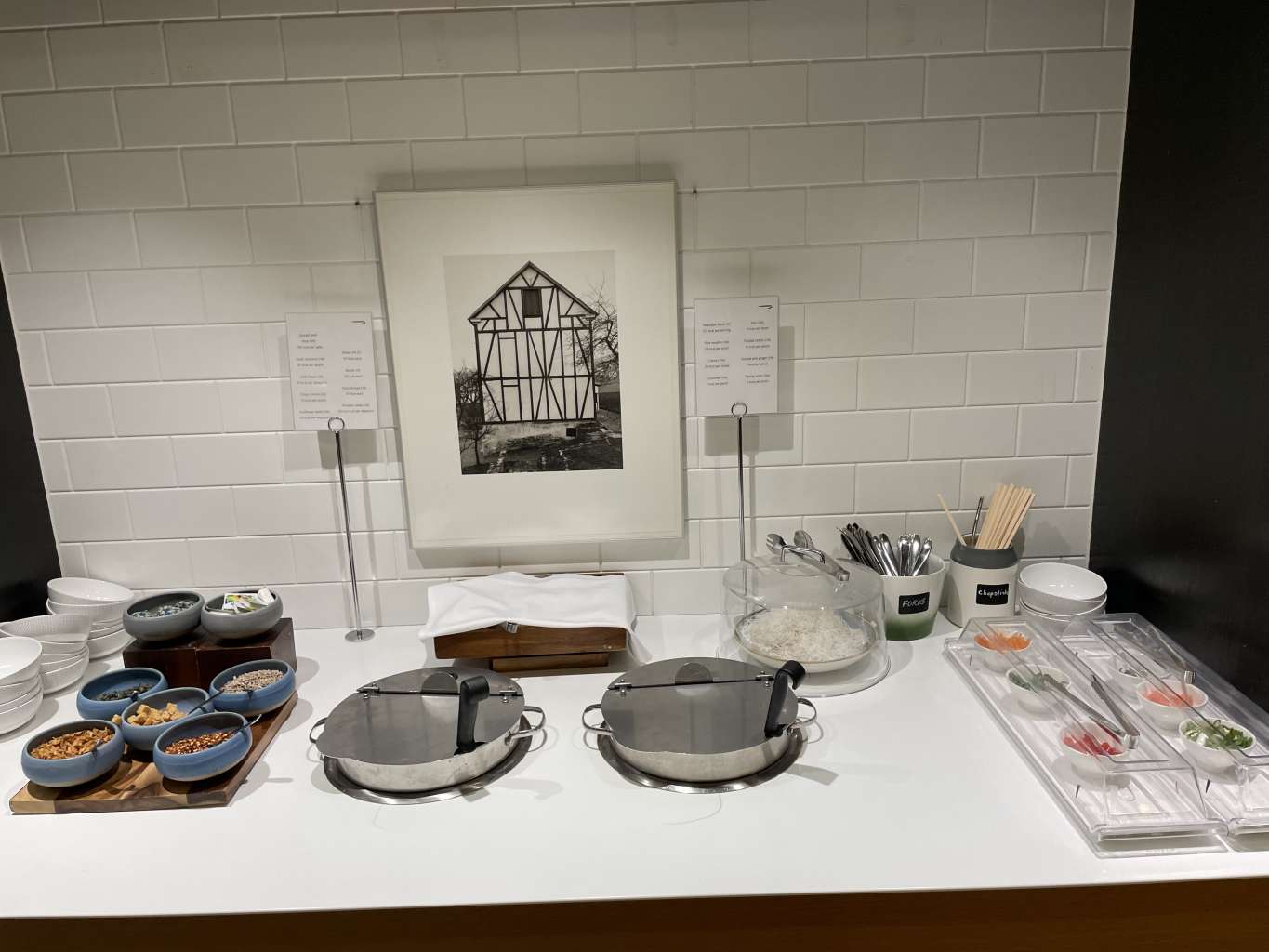 Achtung: An den Tischen findet Ihr auch QR-Codes, die zusammen mit dem Code des Tages auch zu einem separaten Menü führen. Über eine App könnt Ihr Euch dann auch etwas an den Tisch bringen lassen. Das war während der Covid19-Einschränkungen der Standard bei British Airways, wurde aber in der Terminal 3-Lounge beibehalten.