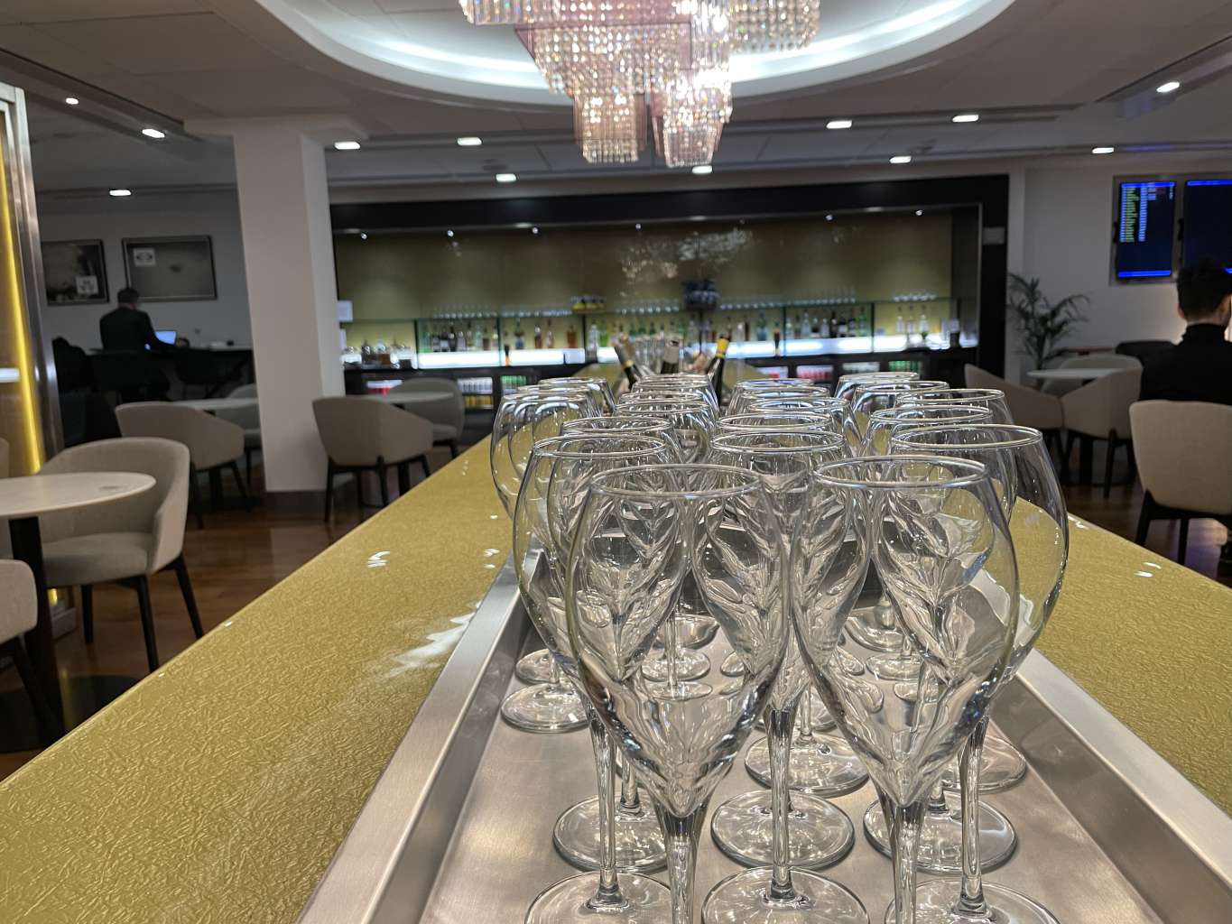 Nach dem Check-In an der Rezeption lauft Ihr durch einen kurzen Gang, in dem schon die ersten Sitzgelegenheiten warten, falls es doch mal etwas voller wird. Bereits hier bekommt Ihr über Displays einen Überblick, wann und wo Euer Flug abgeht. Aber Ihr werdet kaum an dieser Stelle rasten, wenn schon die erste Champagner-Bar prunkvoll „Hereinspaziert“ ruft. Die Champagner-Bar sieht zwar super stylish aus, könnte dennoch etwas gemütlicher eingerichtet sein.