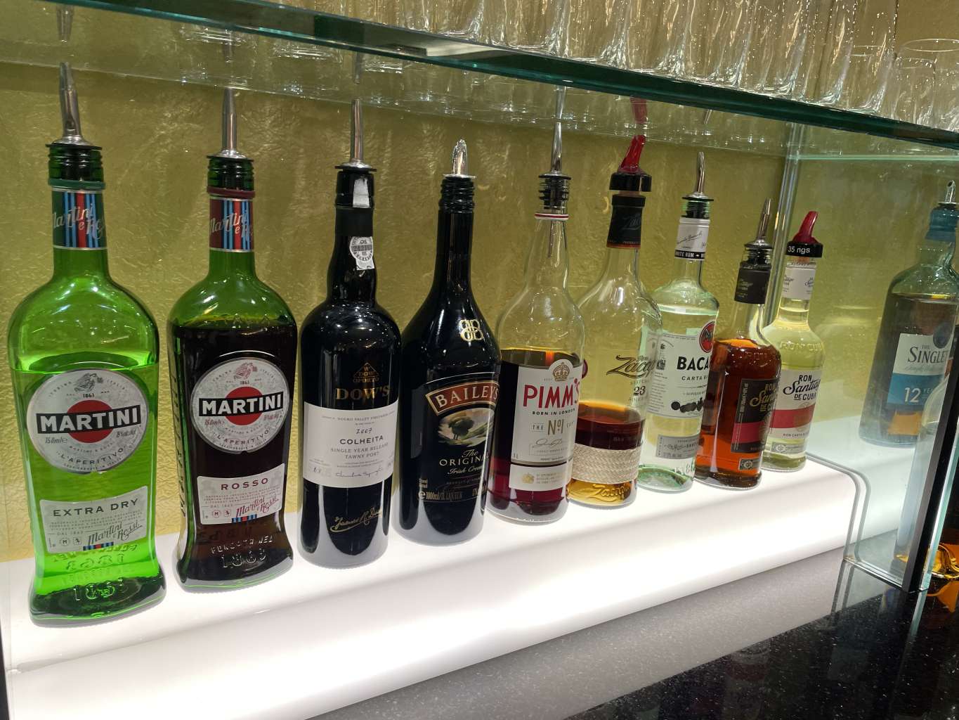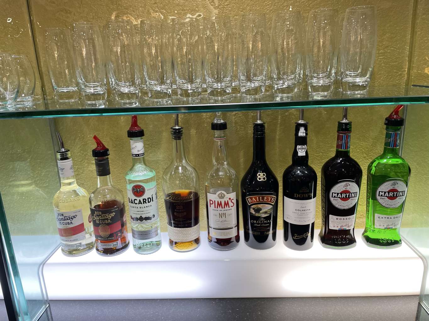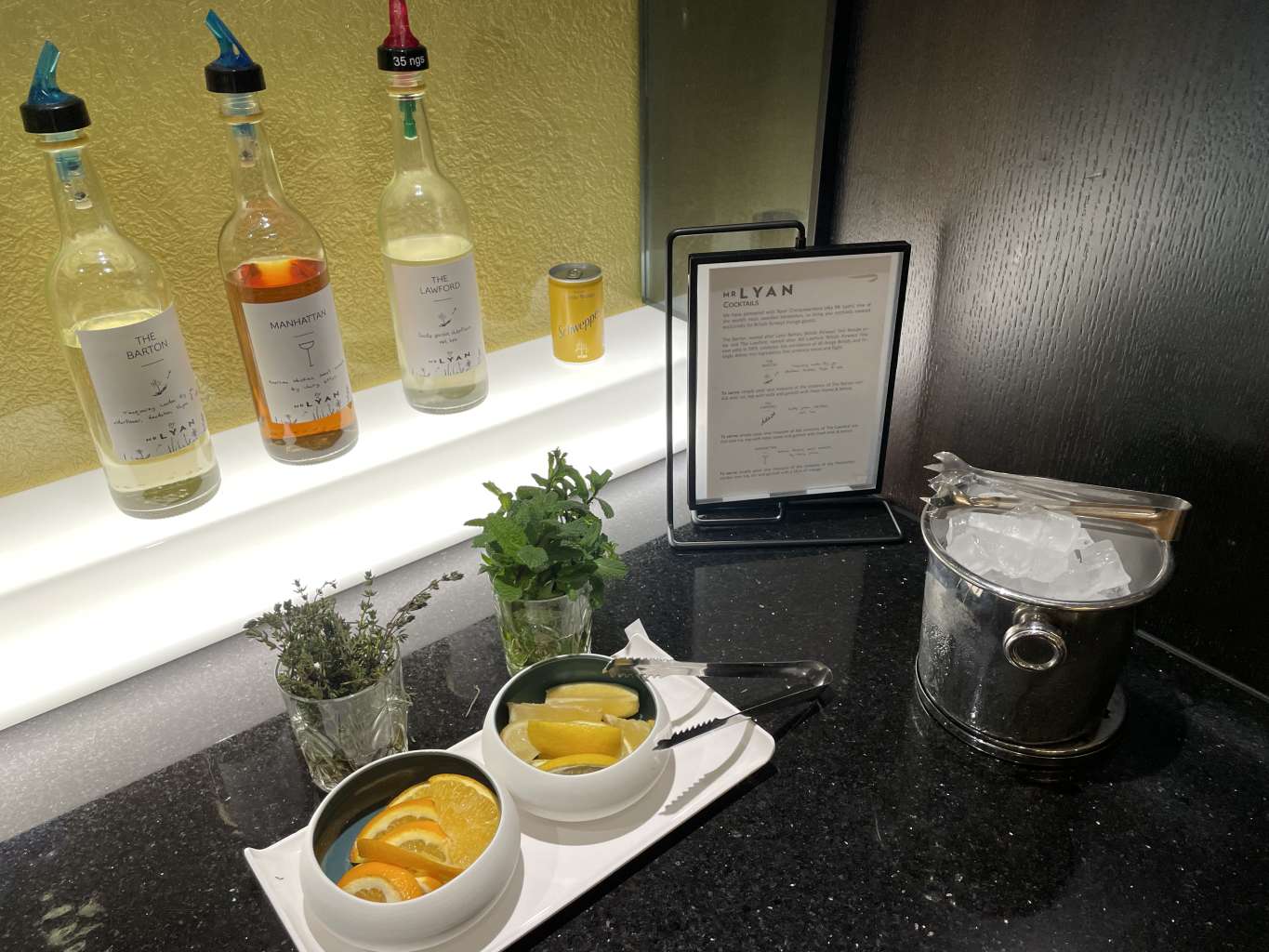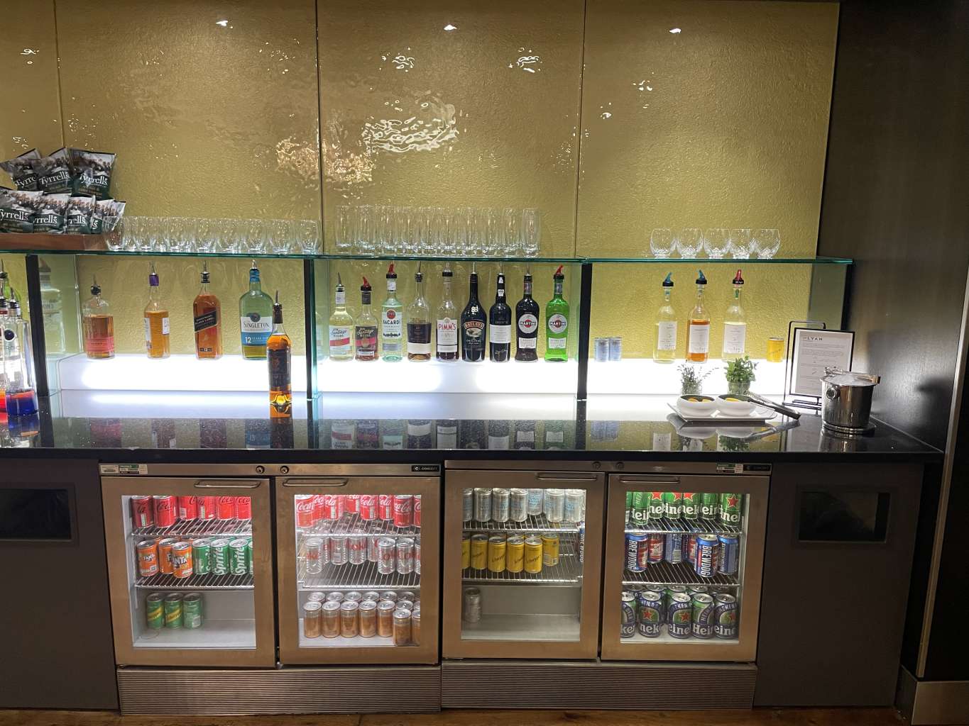 Wenn Ihr aus der British Airways Galleries First Class Lounge nüchtern rauskommt, seid Ihr mehr als diszpliniert. Die Auswahl an alkoholhaltigen Getränken ist unglaublich. Zwar wurde der Johnny Walker Blue Label (war nie meins) schon vor einiger Zeit wegrationalisiert, aber dafür gibt es die komplette Bandbreite an Tanqueray Sorten, Don Julia Tequilas und viele weitere hochwertige Spirituosen. Mein Favorit ist dabei der Zacapa 23 Rum und auch Portwein wird standesgemäß serviert. Ein witziges Feature sind die Mr. Lyan Cocktail-Fertigmischungen, mit denen Ihr Euch Euren eigenen Barton, Manhattan oder „The Lawford“ selbst mixen könnt. Aber auch Champagner ist natürlich im Angebot.