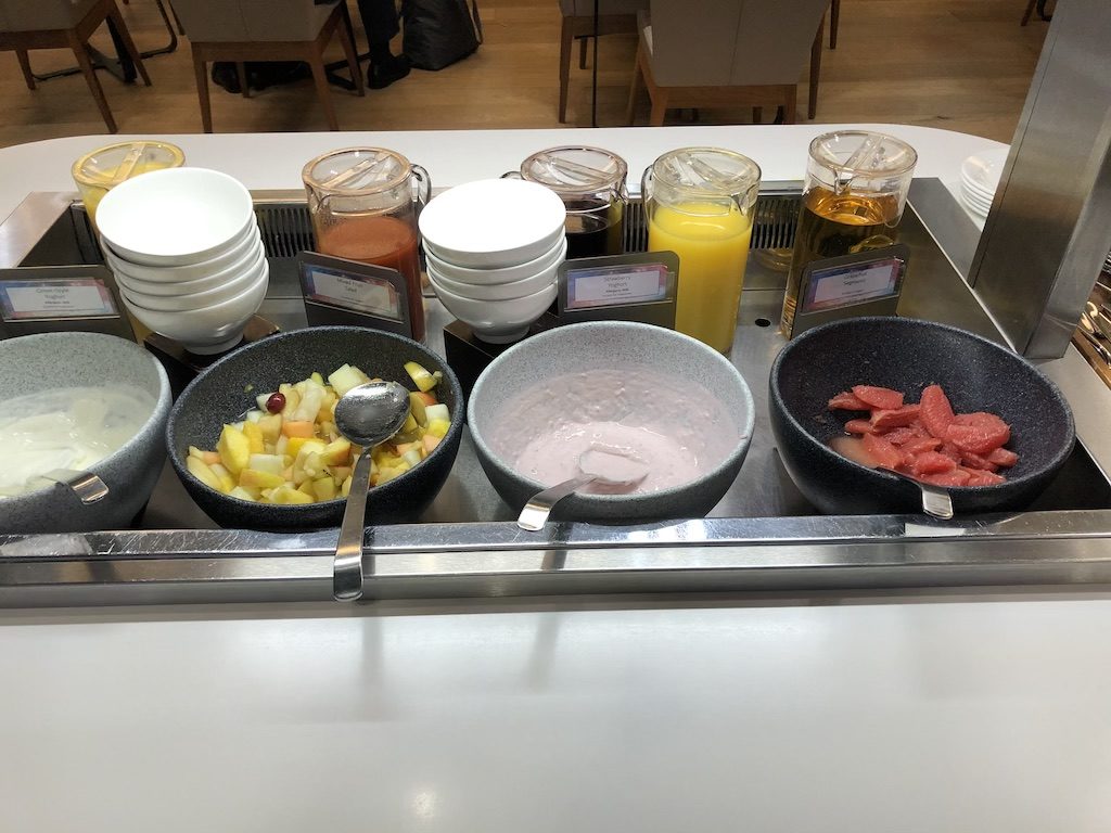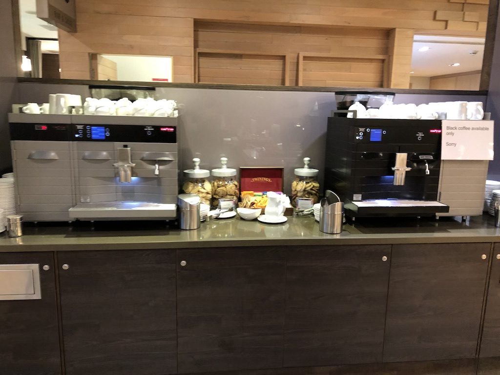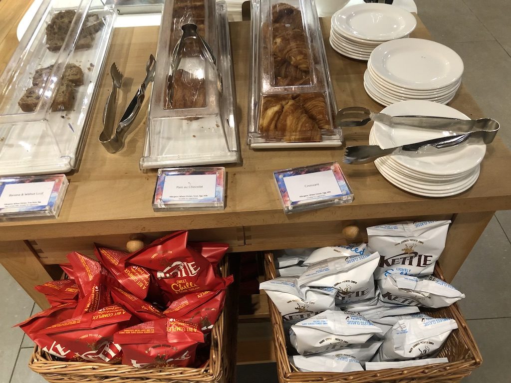 Zur kleinen Lounge passt auch das eher kleine Catering-Angebot. Zur Frühstückszeit gab es Kleinigkeiten wie Gebäck, Obst und Joghurt. Ausreichend für einen Happen, aber insgesamt nichts aussergewöhnliches. Knabbereien, Kekse und abgepackte Snacks werden den ganzen Tag angeboten.