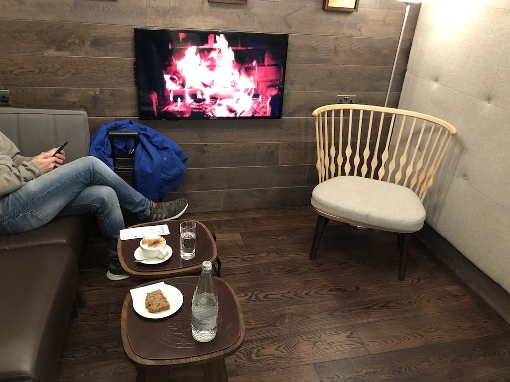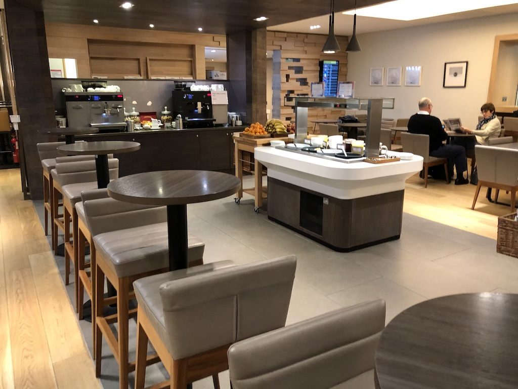 Zentraler Punkt ist das Buffet, welches von Tischen und verschiedenen Sitzmöglichkeiten umgeben ist. Trotz zwei fast parallel abgehenden Flügen und einigen Besuchern war die Atmosphäre ruhig und gemütlich.