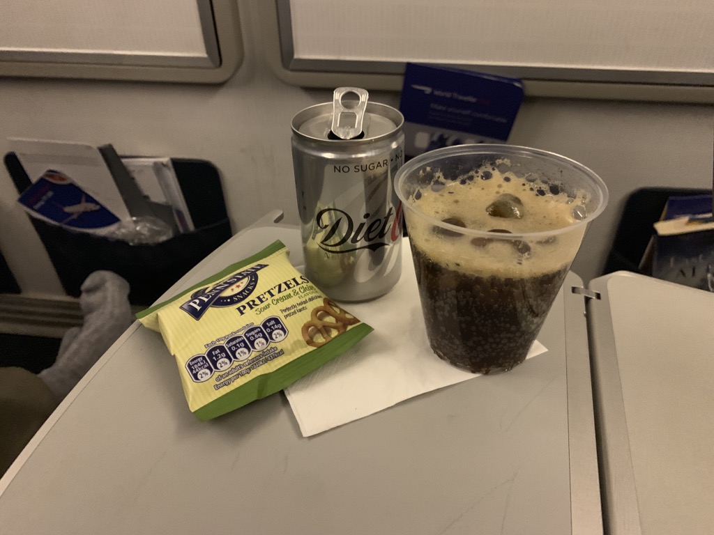 Etwa 45 Minuten nach dem Start wurde der Getränkewagen durch die Kabine geschoben. Hierbei hatte man in der Premium Economy Class die selbe Auswahl wie in der Economy Class, inklusive Plastikbecher.