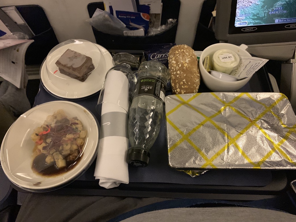 Das Essen wird bei British Airways auf einem riesigen Tablett serviert, welches größer als der sehr kleine Klapptisch war.