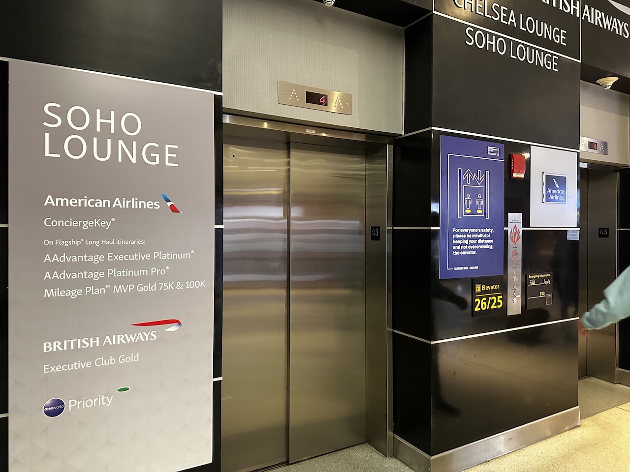 Während sich die Greenwich Lounge an Reisende der Business Class und oneworld Sapphire Kunden richtet, ist die Chelsea Lounge nur für First Class Fluggäste der oneworld Allianz zugänglich. Die Soho Lounge ist quasi dazwischen angesiedelt und für Inhaberinnen und Inhaber des Emerald Status gedacht. Restriktionen gibt es für Kunden, deren Status von American AAdvantage oder dem Alaska Mileage ausgestellt wurde, diese benötigen an dem Tag ein interkontinentales Ticket.