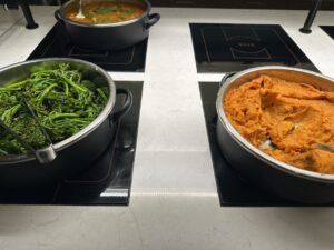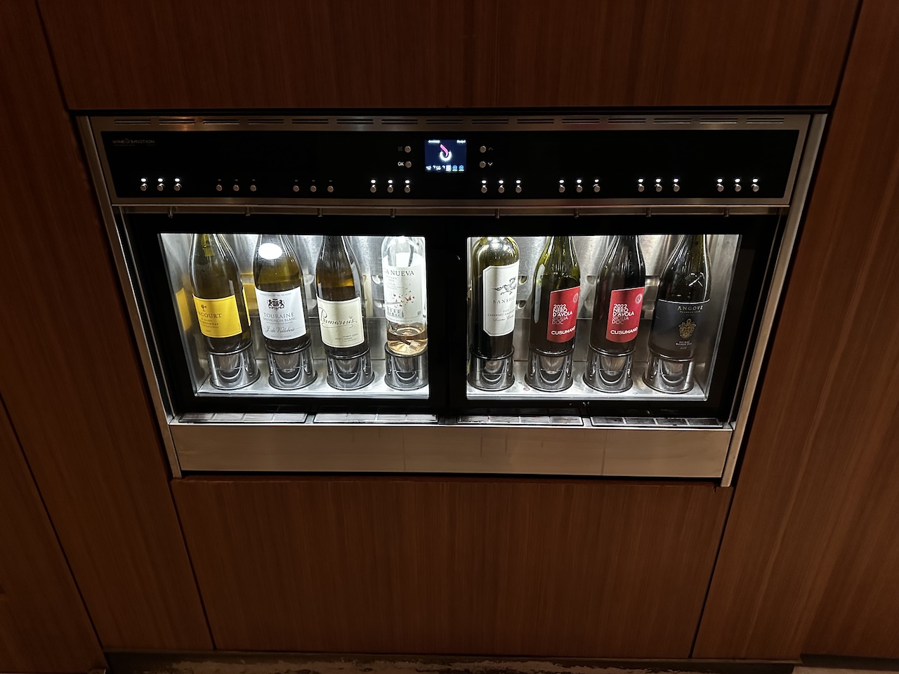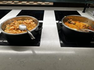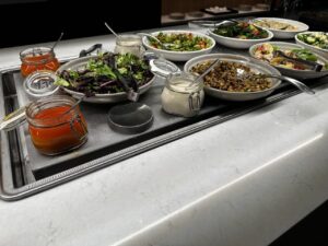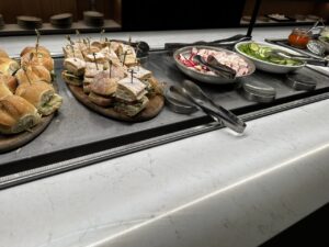 An dem Buffet selbst waren Salate, Sandwiches, warme Speisen mit Fleisch oder Fisch, vegetarische Optionen und Beilagen. Getränke sind im Kühlschrank, Weine können gezapft werden. Das Angebot kann sich sehen lassen, so gab es zahlreiche Softdrinks, Bier, Sekt, Champagner und acht verschiedene Weine.