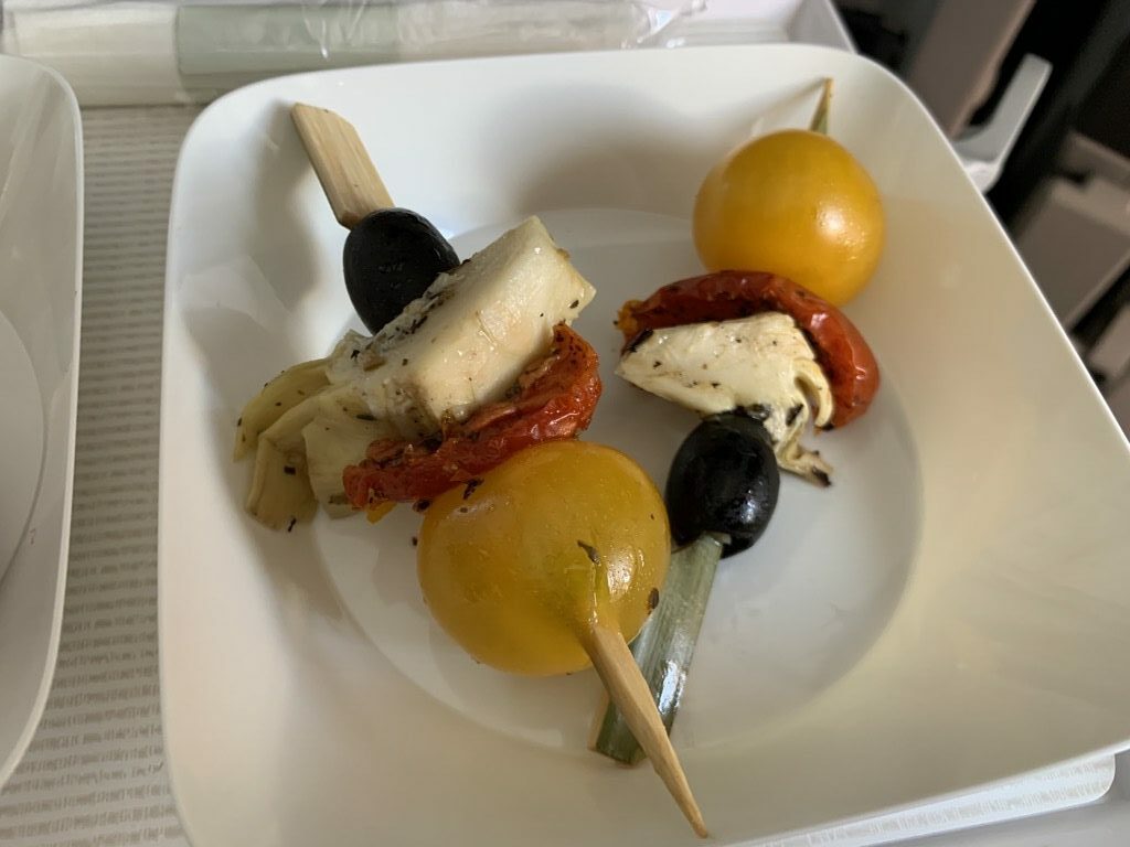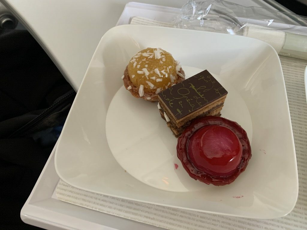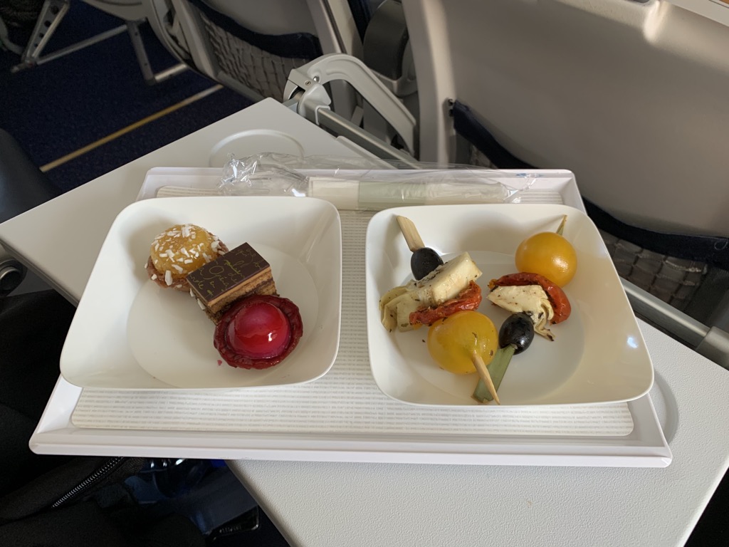 Hierbei wurde eine Tablett mit zwei kleinen Plastiktellern verteilt. Darauf waren süße Teilchen und eine Art Antipasti. Geschmeckt hat es durchaus, die Menge war aber wirklich überschaubar und das Plastik Besteck zum Essen machte leider keinen besonderes wertigen Eindruck auf mich.