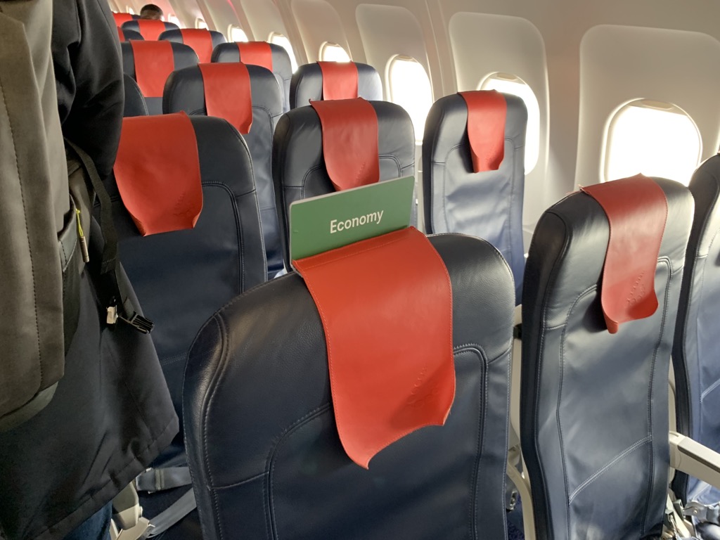 Interessant bei Brussels Airlines ist auch, dass man die Business Class auch optisch quasi nicht von der Economy Class abtrennt. Einen Vorhang gibt es nicht, lediglich ein kleines Pappschild macht darauf aufmerksam, ab wo die Economy Class beginnt. Dass dies zu einiger Verwirrung und auch zu Versuchen sich selbst upzugraden führt, kann man dann schon wieder fast verstehen.
