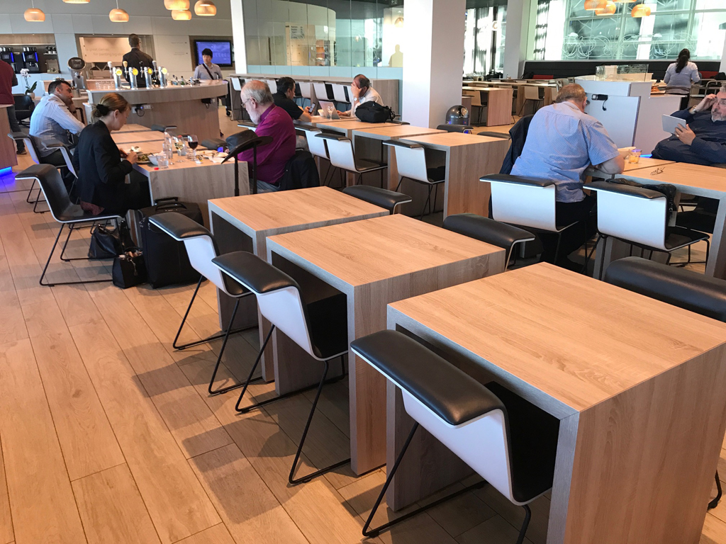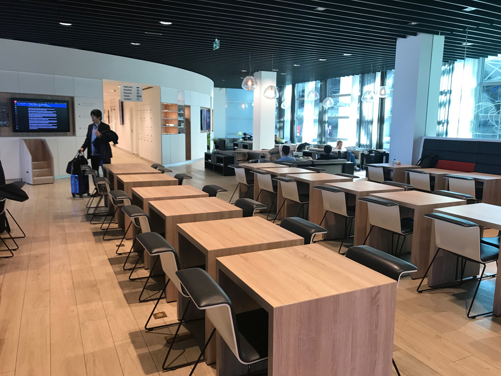 Aber auch für alle anderen Gäste gibt es einen Sitzbereich, jeder Platz verfügt über Strom- und USB-Steckdosen, mit Blick auf das Vorfeld: