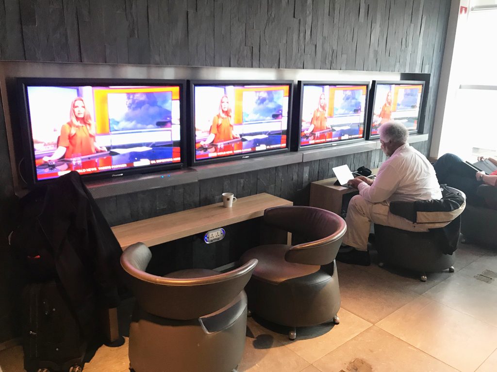 Die Lounge hat zwei Bereiche. Einerseits den großen und zentralen Bereich, andererseits aber auch noch einen „externen“ Zusatzbereich. Zunächst suchte ich aber den zentralen Loungebereich auf. Hier stehen diverse Sitzmöglichkeiten zur Verfügung. Unter anderem gibt es einen Fernsehbereich und Esstische, die einen Vorfeldblick ermöglichen.