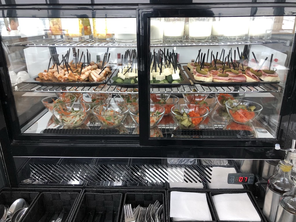 An einer Bar sind kleine Snacks in Form von Sandwiches, Obst und Süßigkeiten aufgestellt. Es war noch morgens und das Angebot entsprach der Frühstückszeit. Neben Pasteten waren auch noch warme Rühreier im Sortiment. Nichts weltbewegendes, aber durchaus ausreichend.