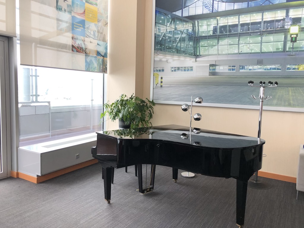 Anhand mehrerer Abflugtafeln hatte ich den Flugstatus im Blick, es gab auch Boardingaufrufe. Diese waren aber nicht so zahlreich, dass man es als störend hätte empfinden können. Neben einem Klavier habe ich es mir dann zum leichten Frühstück bequem gemacht. Ob hier ab und zu jemand spielt?