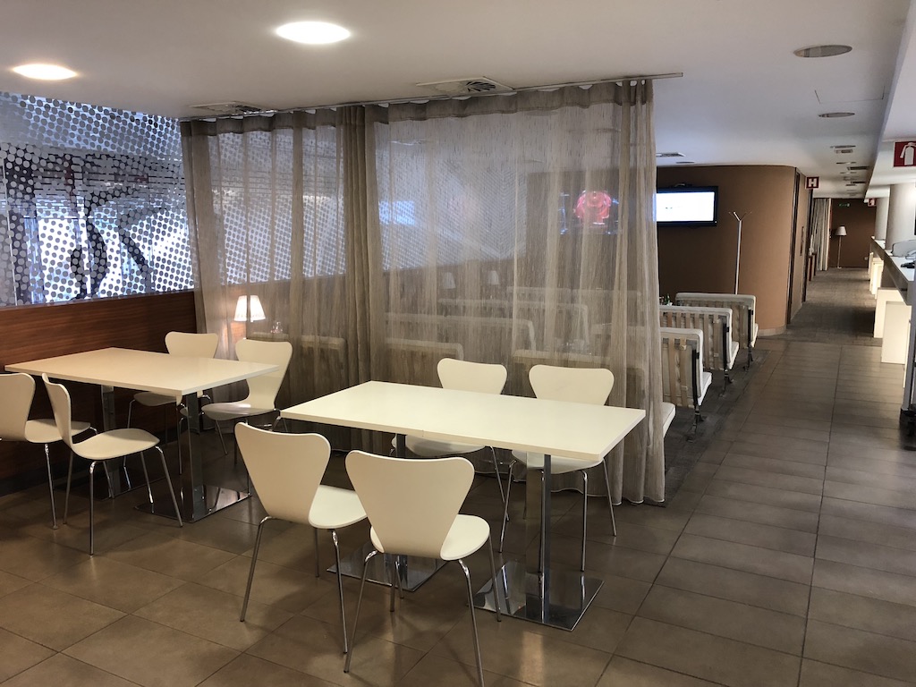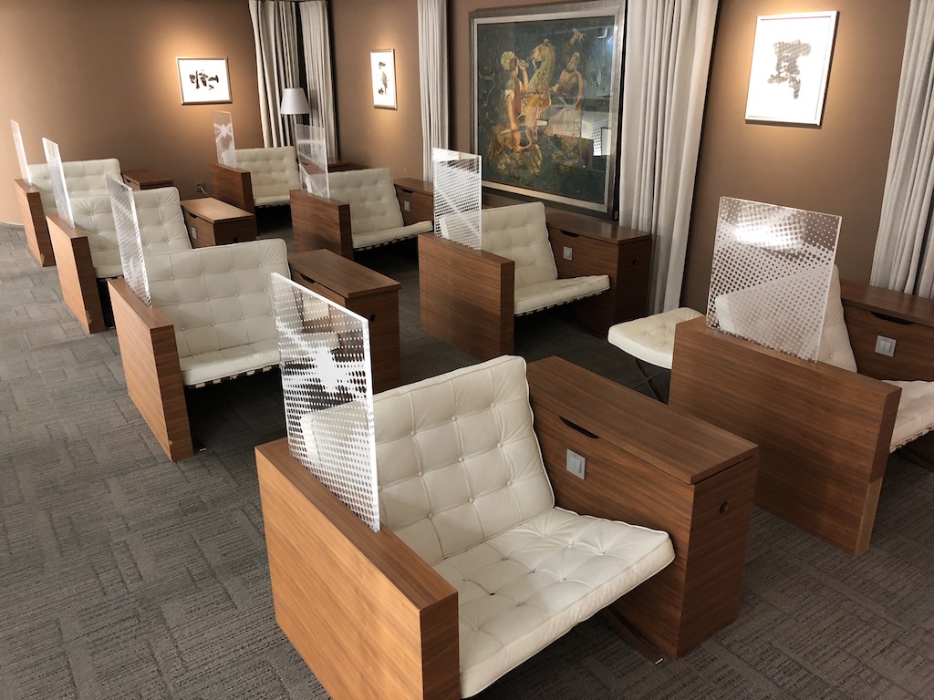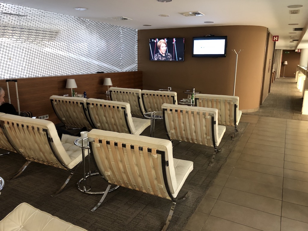 An den ersten Bereich schließt sich ein weiterer Loungebereich mit vier Einzel- und vier Doppelsesseln aus weißem Leder an, welche jedoch über keine Armlehnen, Ablagen oder Steckdosen verfügen. Diese sind also weder besonders bequem noch nützlich. Der Raum wirkt wie ein kleiner Kinosaal, ohne Leinwand, dafür jedoch ein Fernseher auf welchem Nachrichten und Sport gezeigt werden.