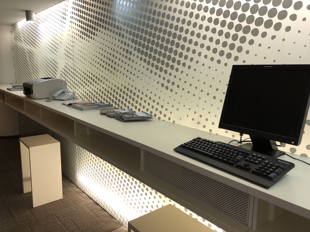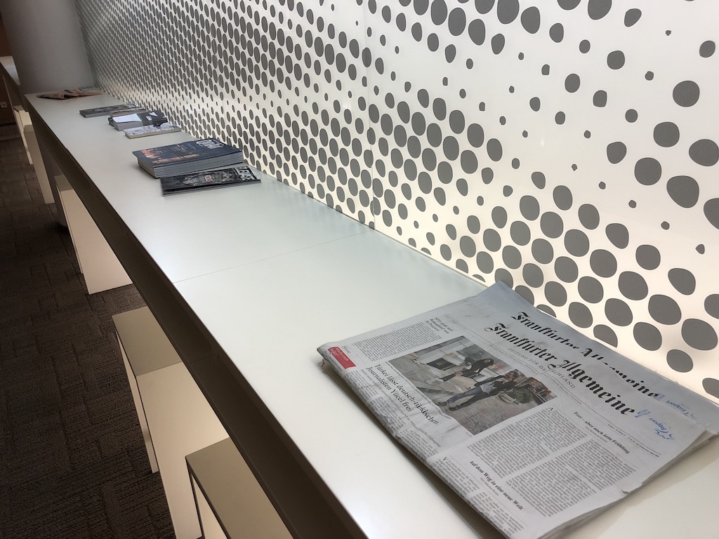 Geht man der Länge nach entlang der Wand weiter in die Lounge kommt man an einem Tresen mit mehrsprachigen Zeitungen und Magazinen vorbei, wobei die Frankfurter Allgemeine bereits zwei Tage alt war. Daneben befindet sich ein Arbeitsrechner, sowie ein Drucker um Dokumente auszudrucken.