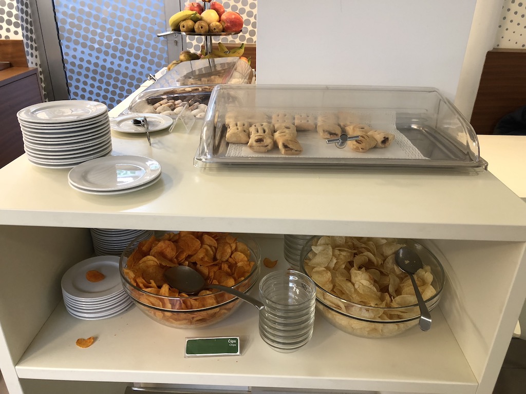 Wir besuchten die Lounge lediglich für rund 20 Minuten zur Mittagszeit und verschafften uns einen schnellen Überblick. Im Speisebereich der Lounge stehen Chips und Salzstangen auf den Tischen. Am Buffet stand Suppe, eine Auswahl an kleinen Salaten, abgepackte Sandwiches sowie Käse bereit. Zusätzlich standen einige Kekse und Gebäck, vermutlich vom Frühstück zur freien Verfügung. Obst, darunter Äpfel, Bananen und Birnen, stand ebenfalls bereit.