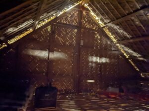 Munting Silid’s sind so gebaut das sie Öffnungen haben. Zum einen zwischen dem Dach und dem Boden. Trotz der Bauweise ist man vor starkem Wind und Regen geschützt. Wenn der Luftzug nicht ausreicht kann ein Ventilator genutzt werden, den die Betreiber zur Verfügung stellen. Der Schlafbereich befindet sich auf der ersten Etage und ist aufgrund der steilen Treppe nicht für ältere Personen gedacht, oder andere Personengruppen die damit Probleme haben. Im Zweifelsfall empfehle ich Euch Kontakt zu den Betreibern aufzunehmen und Optionen zu klären. Unter dem Schlafbereich befindet sich der Essbereich.