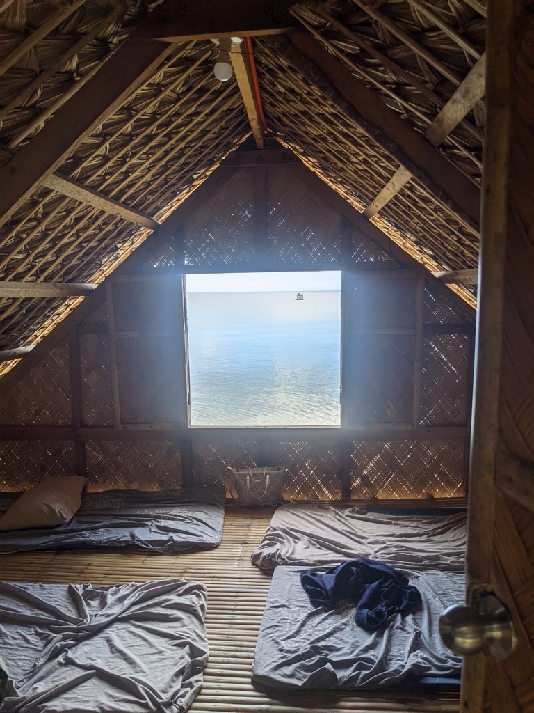 Wir haben in der sog. Munting Silid Wohneinheit übernachtet, welche sich auf dem Strand befinden, aus Bambus gebaut sind und ein Fenster mit Meerblick bieten. Unter dem Schlafbereich steht ein Tisch, ein Mülleimer, zwei Bänke so wie eine Hängematte zur Verfügung. Wenn Ihr diese Wohneinheit bucht, dürft Ihr zwei 2-3 Personenzelte dort aufbauen. Die gesamte Wohneinheit inkl. Zeltplätze ist gemäß Webseite für bis zu 15 Personen ausgerichtet und kostet zum Zeitpunkt der Review 6000 PHP. Abhängig vom Wechselkurs sind das ca. 105 Euro. Ich empfehle 15 Personen auf zwei dieser Wohneinheiten zu verteilen.