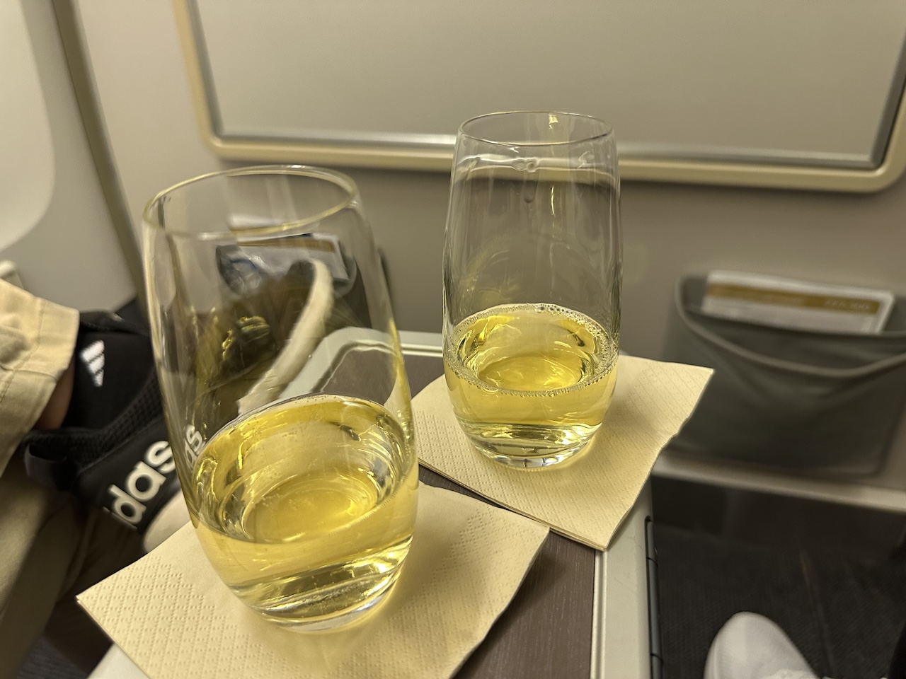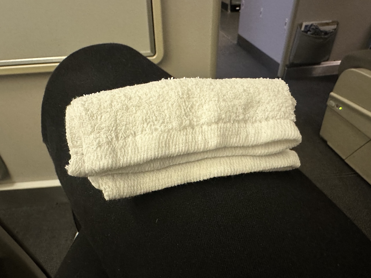 Die Crew hat uns sehr herzlich begrüßt, nur wenige Augenblicke später hat sich die Purserin namentlich vorgestellt und gefragt ob alles in Ordnung ist. Noch vor allen anderen wurden die Statuskunden nach den Essenswünschen abgefragt. Danach gab es heiße Tücher und ein Willkommensgetränk.