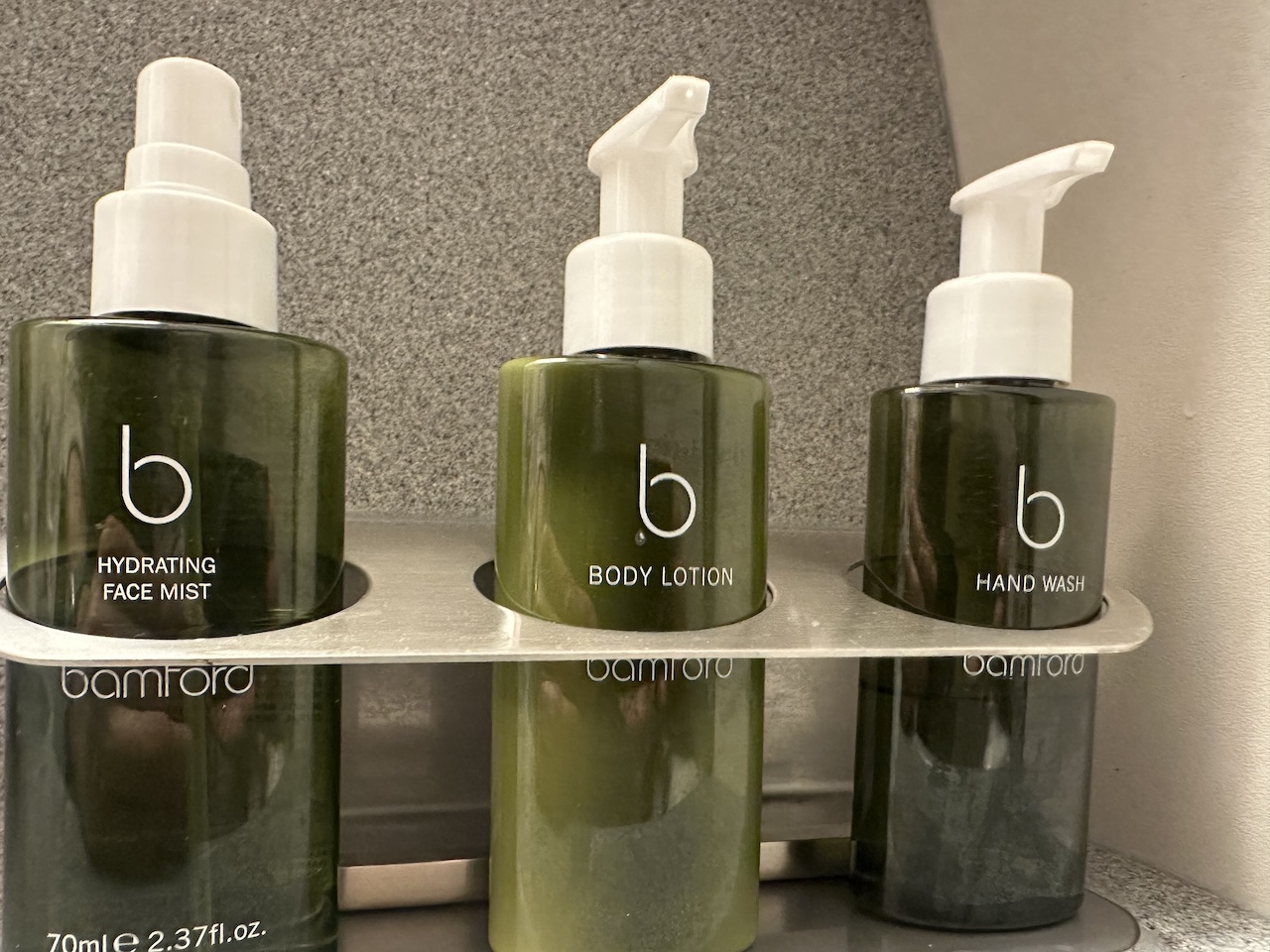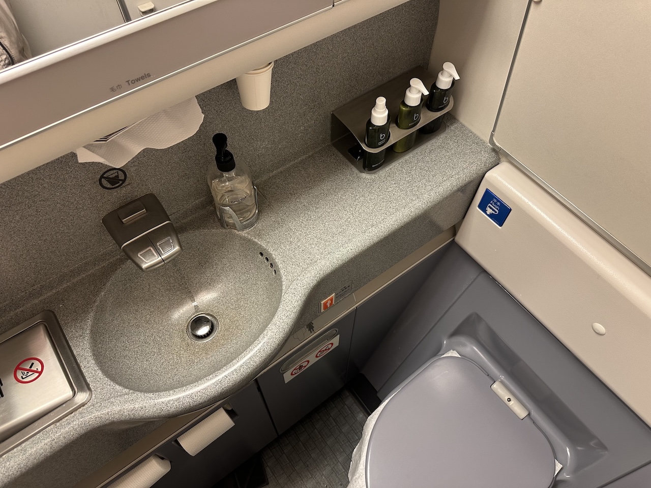 Wie immer haben wir uns auch hier die Waschräume angesehen. Diese waren bei dem älteren Jet natürlich nicht mehr so modern, aber gepflegt und sauber. Für die Gäste sind hier Pflegeprodukte verfügbar.