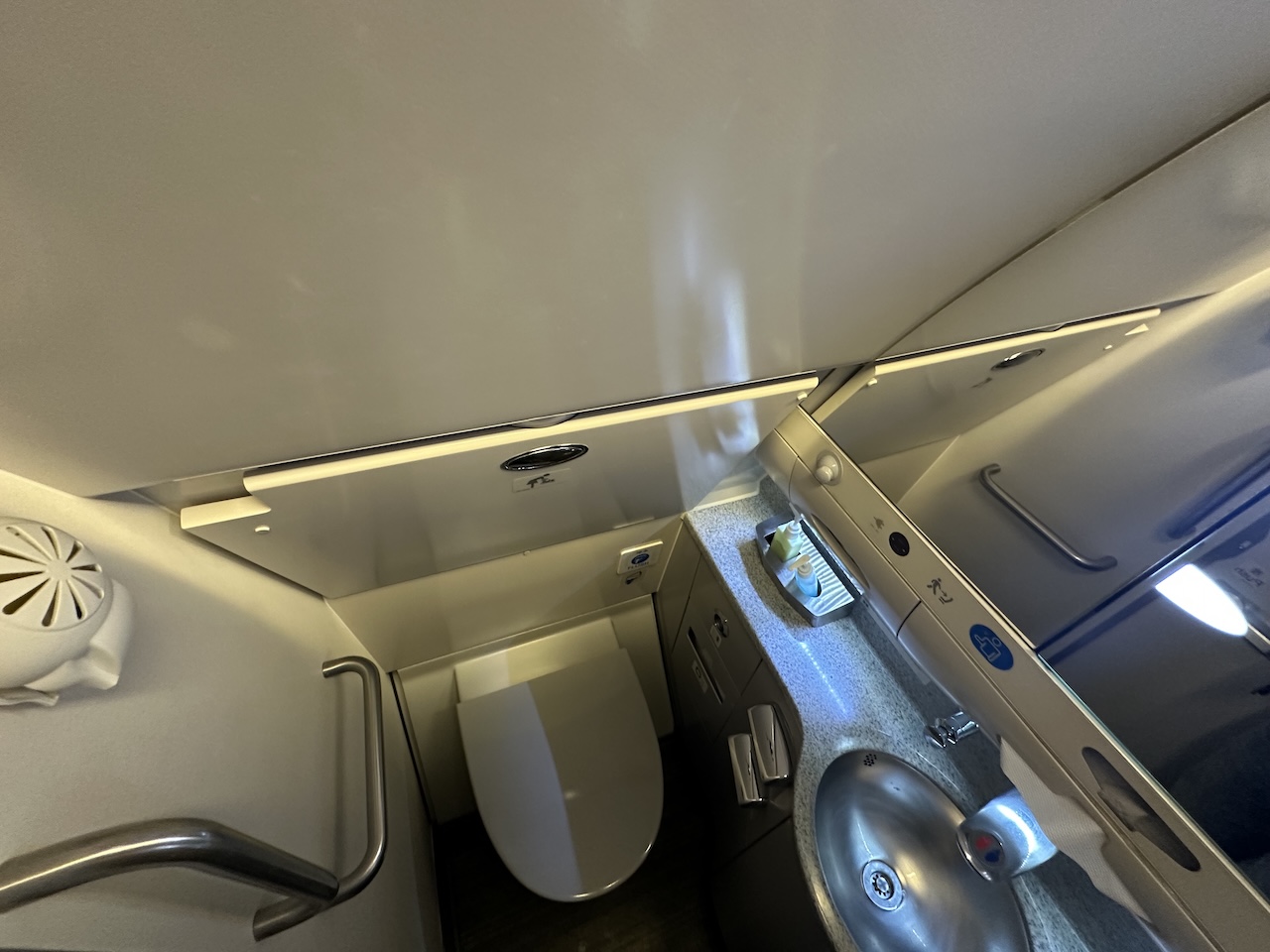 Die Economy Class ist in einer 2-4-2 Anordnung bestuhlt, alle Sitze haben eigene Monitore mit Fernbedienung und Kopfhöreranschluss sowie Steckdosen. Hier noch der Blick in den Waschraum: