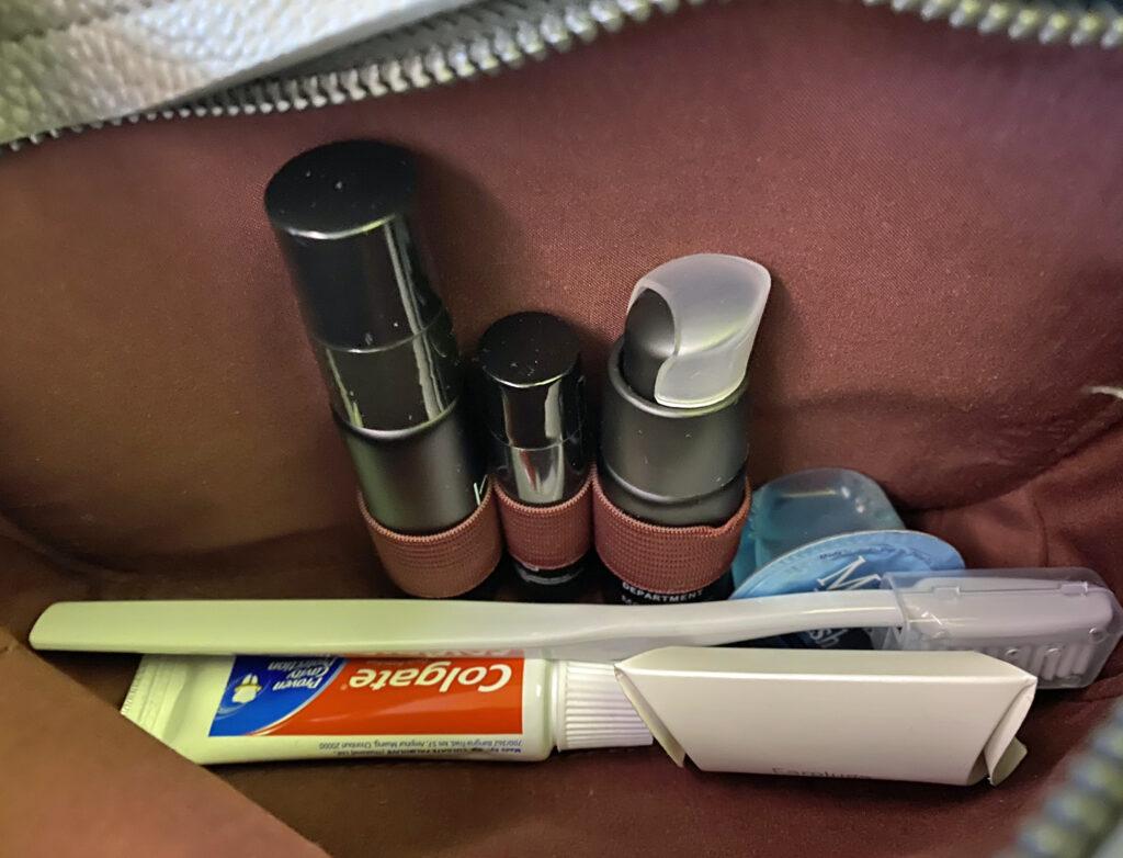 Das Ledermäppchen des Amenity Kits hat mir sehr gut gefallen. Der Inhalt aus generischer Zahnbürste, Zahnpasta, Mundspülung und Ohrstöpseln. Ist da schon enttäuschend. Die Cathay Schlafmaske hat zwar eine bessere Qualität als die, die man oft in der Business Class bekommt, aber rausreißen kann sie da nichts. Die Bamford Artikel Lippenbalsam, Gesichtscreme und Feuchtigkeitsspray haben mich auch nicht begeistert. Da bieten andere Airlines mehr.