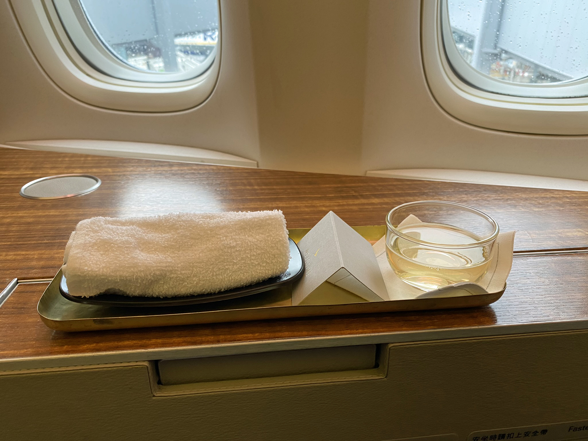 Wie schon beschrieben gab es zur Begrüßung ein heißes feuchtes Tuch mit einem Schälchen perlenden Jasmintee – eine Innovation des neuen First Class Konzepts bei Cathay. Diese wurden auf einem kleinen Metalltablett auf meiner Seitenablage abgestellt. Zusätzlich fand ich dort noch eine handgeschriebene Begrüßungskarte der beiden Flugbegleiterinnen der First Class. Eine sehr freundliche Aufmerksamkeit.