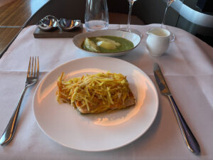 Ein angenehmer Vorteil der First Class bei Cathay ist, dass man das Essen zu einem selbstgewählten Zeitpunkt serviert bekommt. Das Frühstück sollte jedoch mind. 45 Minuten vor der Landung anfangen, da man sonst zu wenig Zeit zum Essen hat (sofern man ein ganzes First Class Frühstück bekommen möchte. Wem eine Tasse Kaffee reicht kann länger schlafen).
