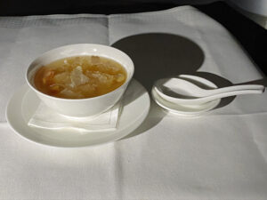 Das Zwischengericht bestellte ich mit Lammfleisch, welches vorzüglich war. Beim Hauptgang kam die bayerische Forelle etwas fad und trocken daher hat mich dieses Gericht nicht überzeugt. Die chinesische Pilzsuppe zum Nachtisch war dagegen hervorragend. Eine Flugbegleiterin legte sie mir ans Herz. Und die Suppe enttäuschte nicht.