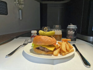 Wer während des Flugs noch einmal Hunger bekommen sollte darf aus vier „All Day“ Gerichten einen Snack auswählen. Ich entschied mich für den Hamburger, den ich mit einem Betsy Bier begleitete. Das Betsy Bier ist übrigens nur bei Cathay Pacific erhältlich. Angeblich in der Eco und Premium Eco in der Dose und in Business und First in der Flasche, aber auch ich habe es in einer Dose serviert bekommen.