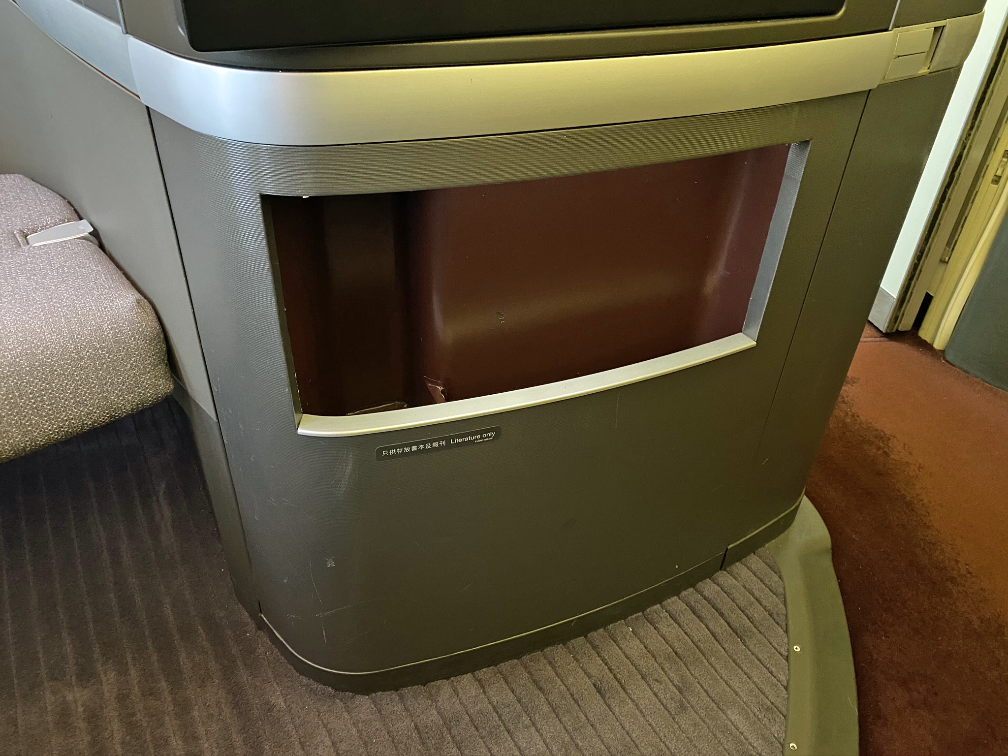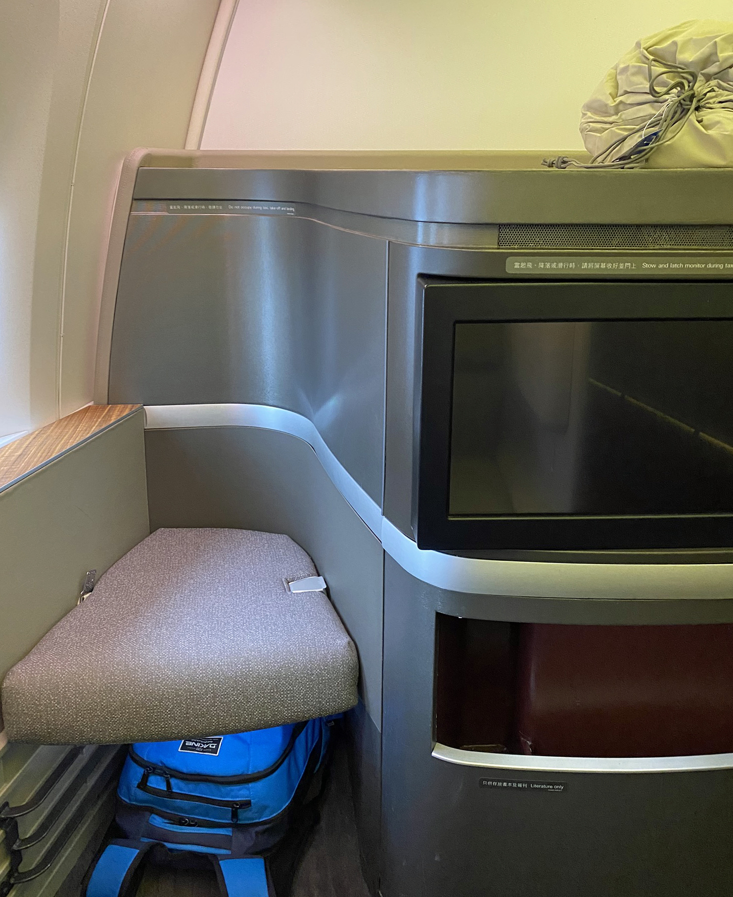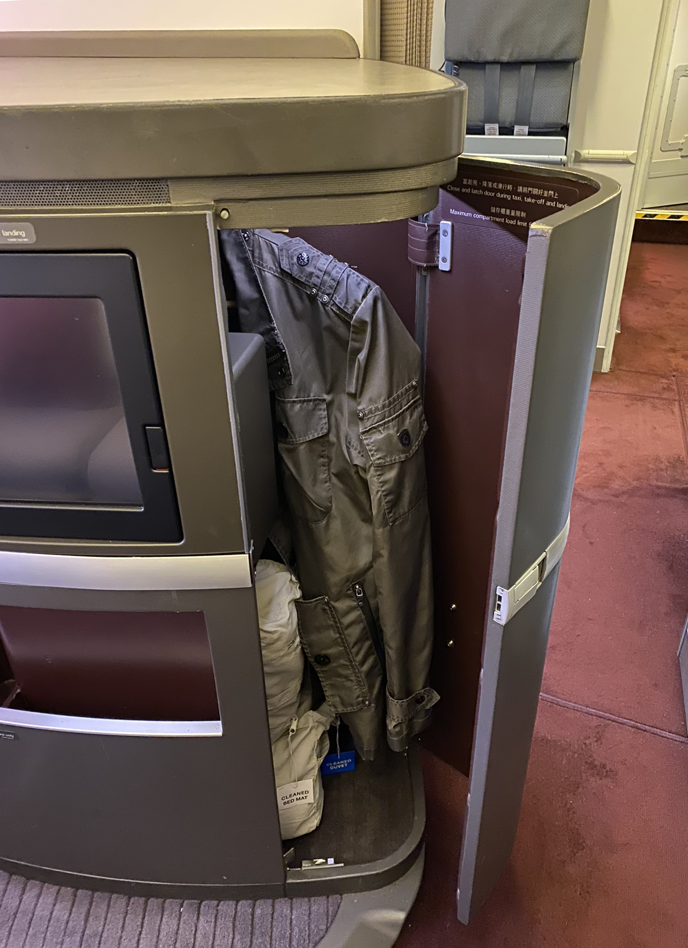 Da es keine Overhead Bins gibt, muss das mitgebrachte Gepäck anderweitig verstaut werden. Hinter dem Monitor (wenn er „eingefahren“ ist) befindet sich ein Schrank. Dort können z.B. Jacken, Hemden usw. aufgehängt werden. Außerdem befindet sich die Bettwäsche dort.