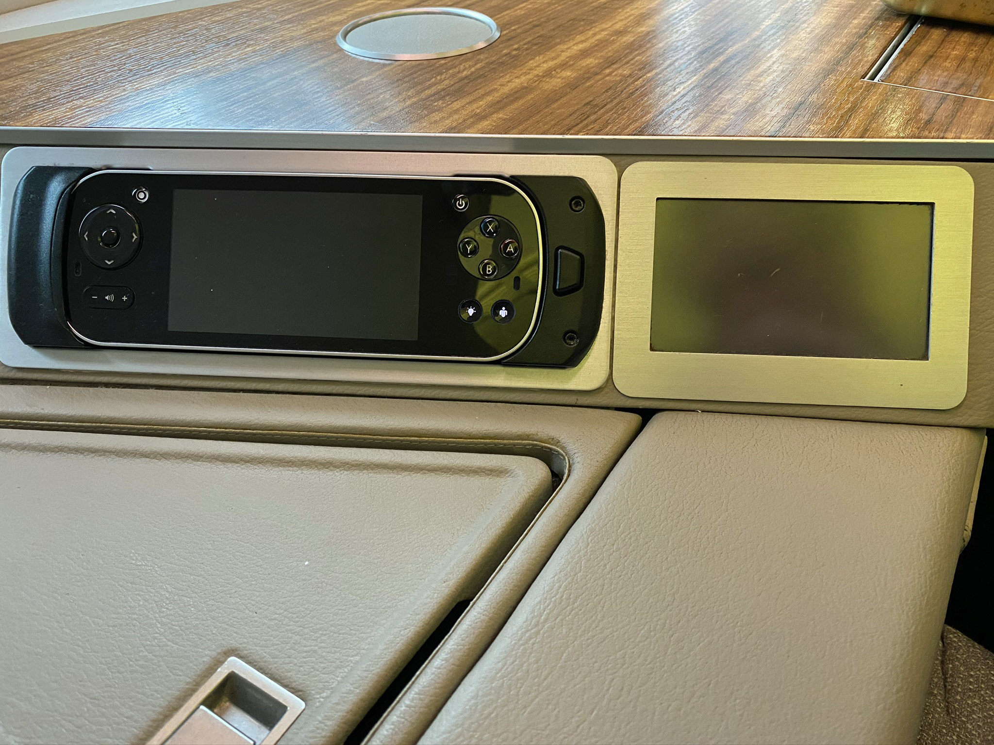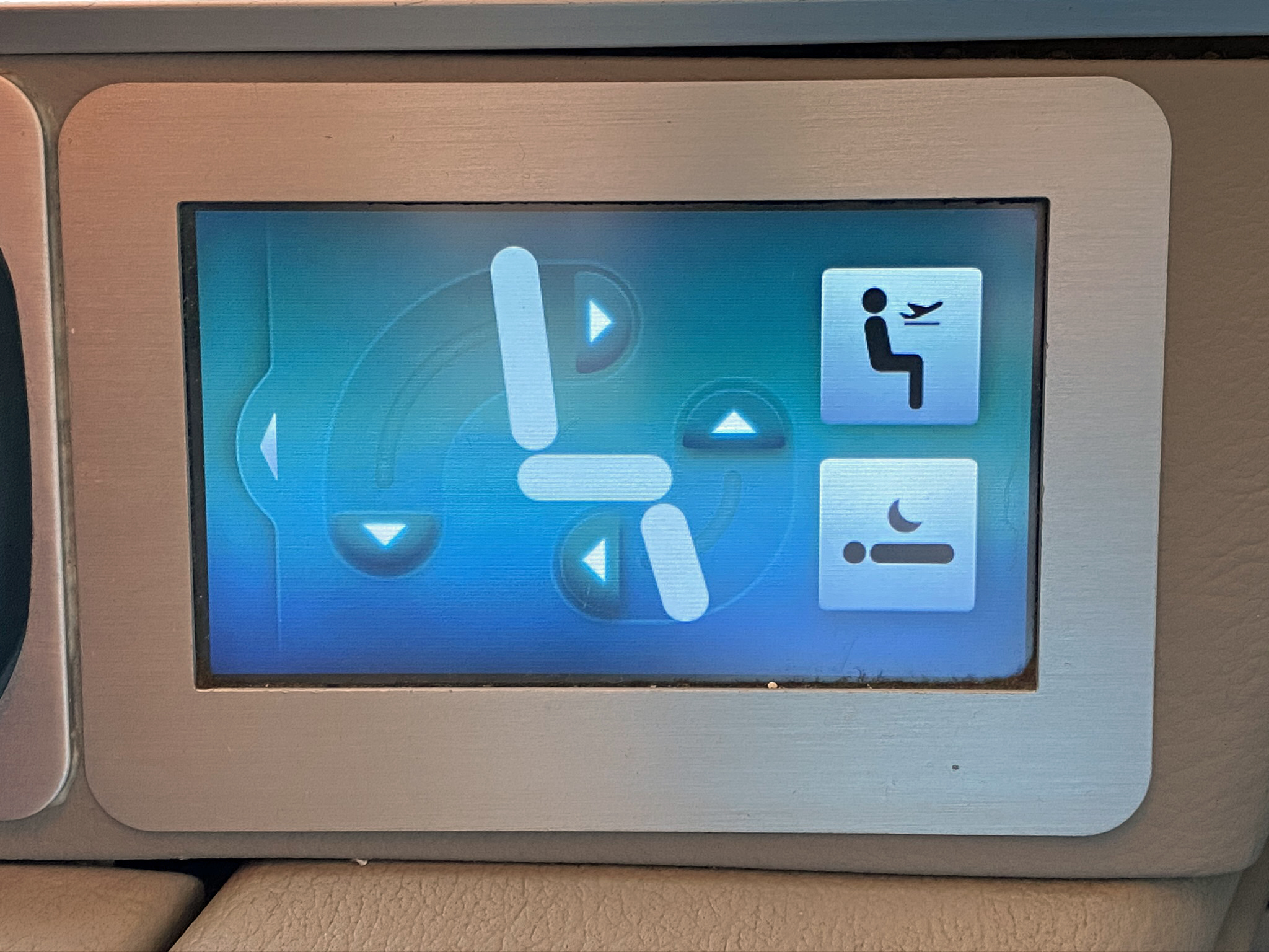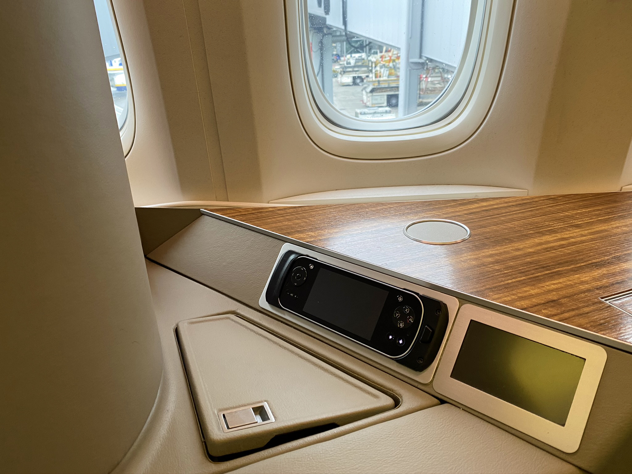 Der HD-Monitor ist mit 18,5 Zoll (47 cm) nicht riesig, aber aus meiner Sicht ausreichend. Vor dem Refresh der Sitze waren sie noch etwas kleiner und hatten noch keine HD Auflösung. Der Monitor ist im Ausgangszustand in eine Halterung eingeschoben. Wenn man ihn bequem nutzen möchte, zieht man ihn heraus. Dann „schwebt“ er und man kann geradeaus drauf gucken. Solche Lösungen gibt es in der Business Class häufig, daher ist das ein kleiner Aspekt, der nicht ganz die volle Punktzahl für eine First Class bringt.