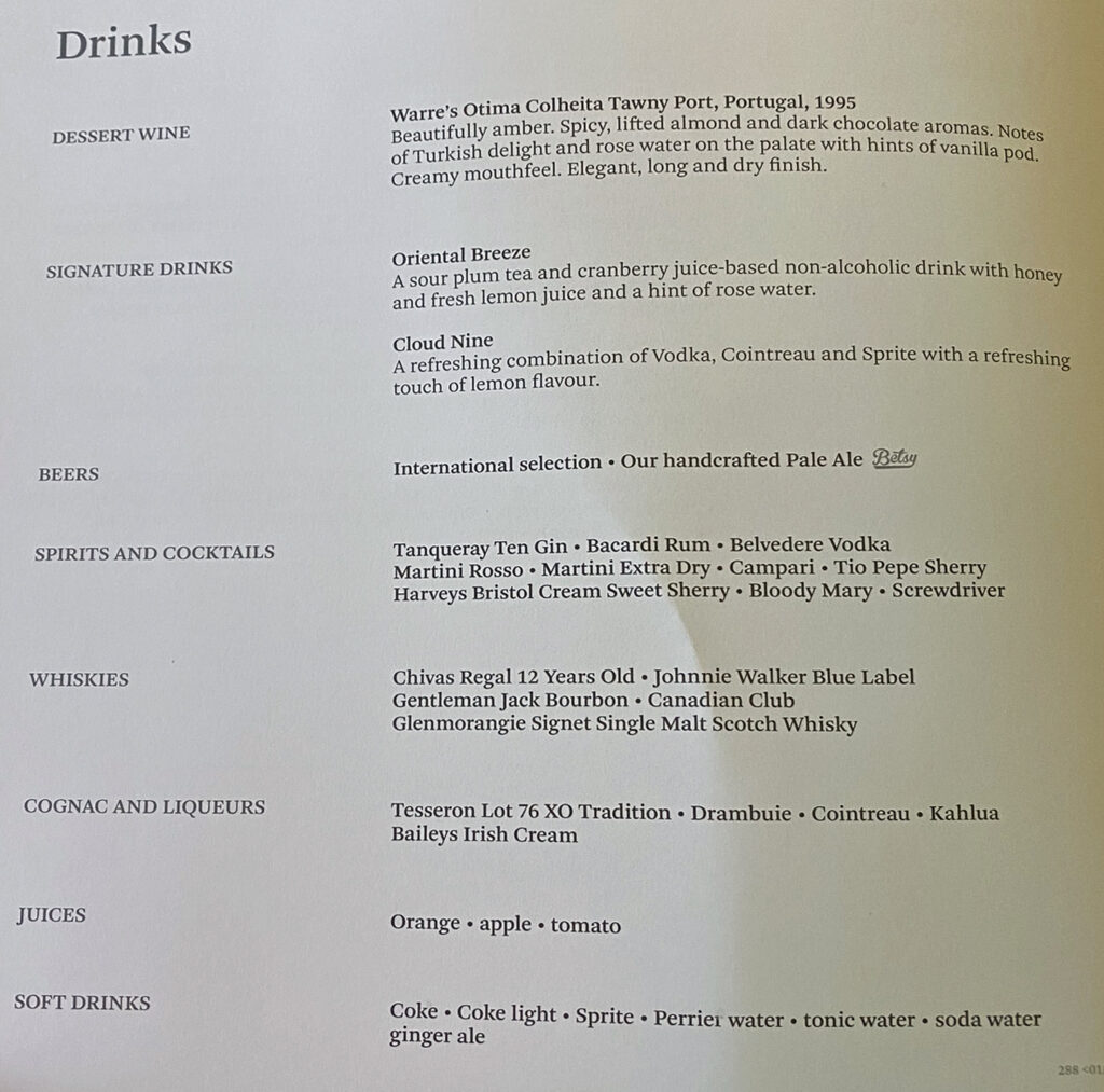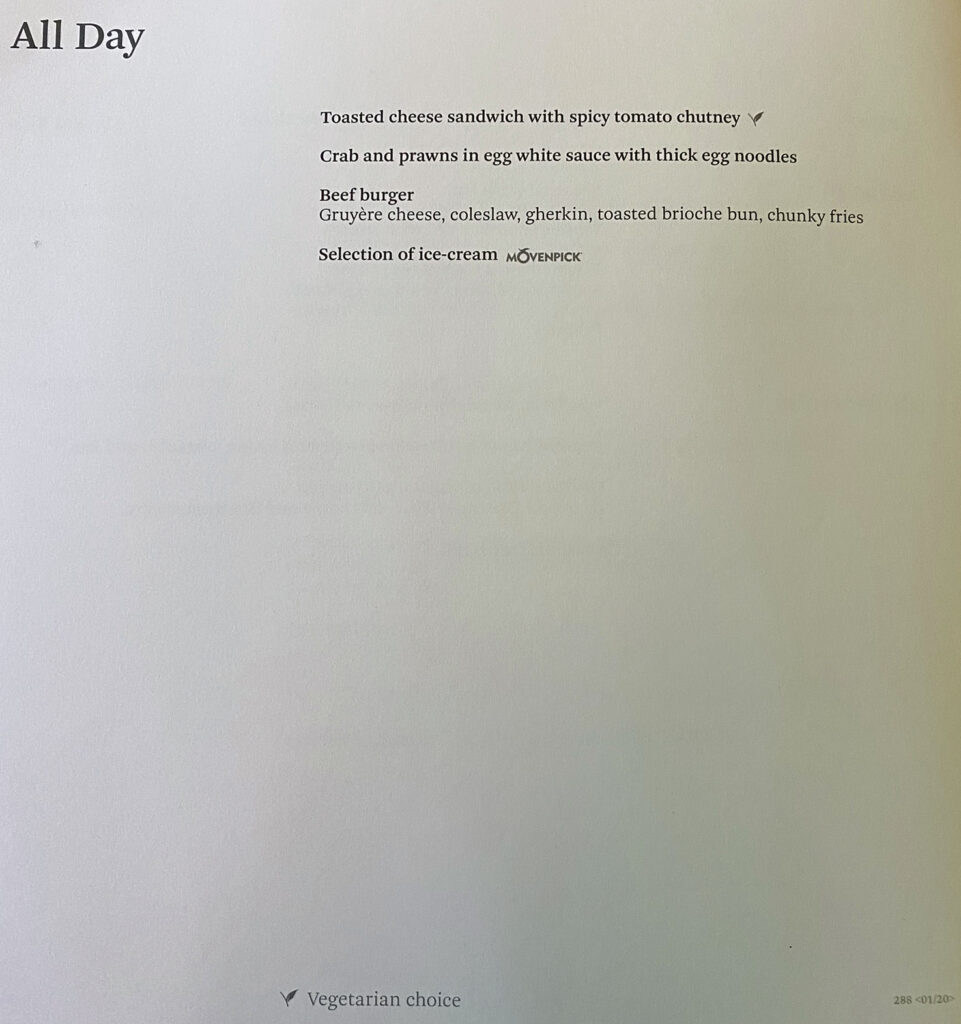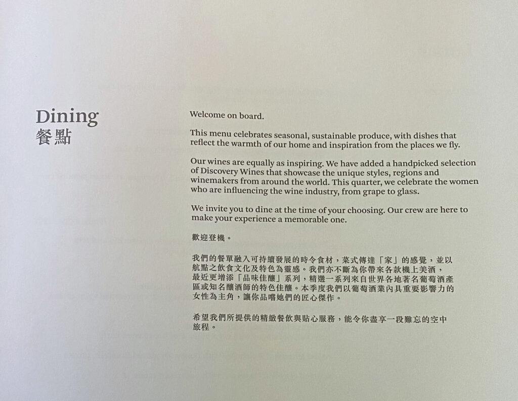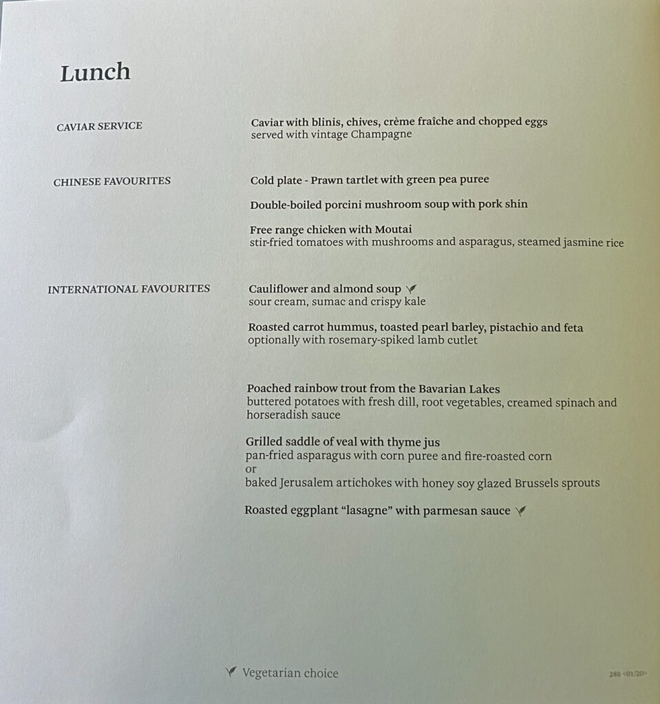 Auf der Strecke Frankfurt – Hong Kong bestellen Gäste das Mittagessen tendenziell früh. Dadurch verbleibt mehr Zeit zum Schlafen bis zur Ankunft in Hong Kong um 6 Uhr morgens. Aus dem Menü darf man in Mix and Match Manier sein Essen zusammenstellen wie man möchte. Solange genug geladen ist, bekommt man es auch serviert.