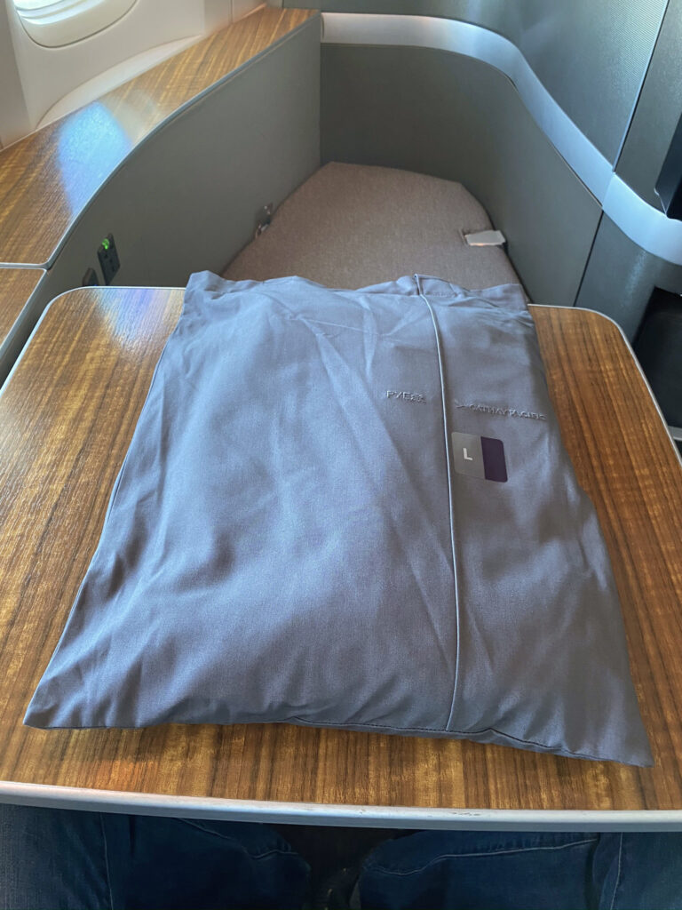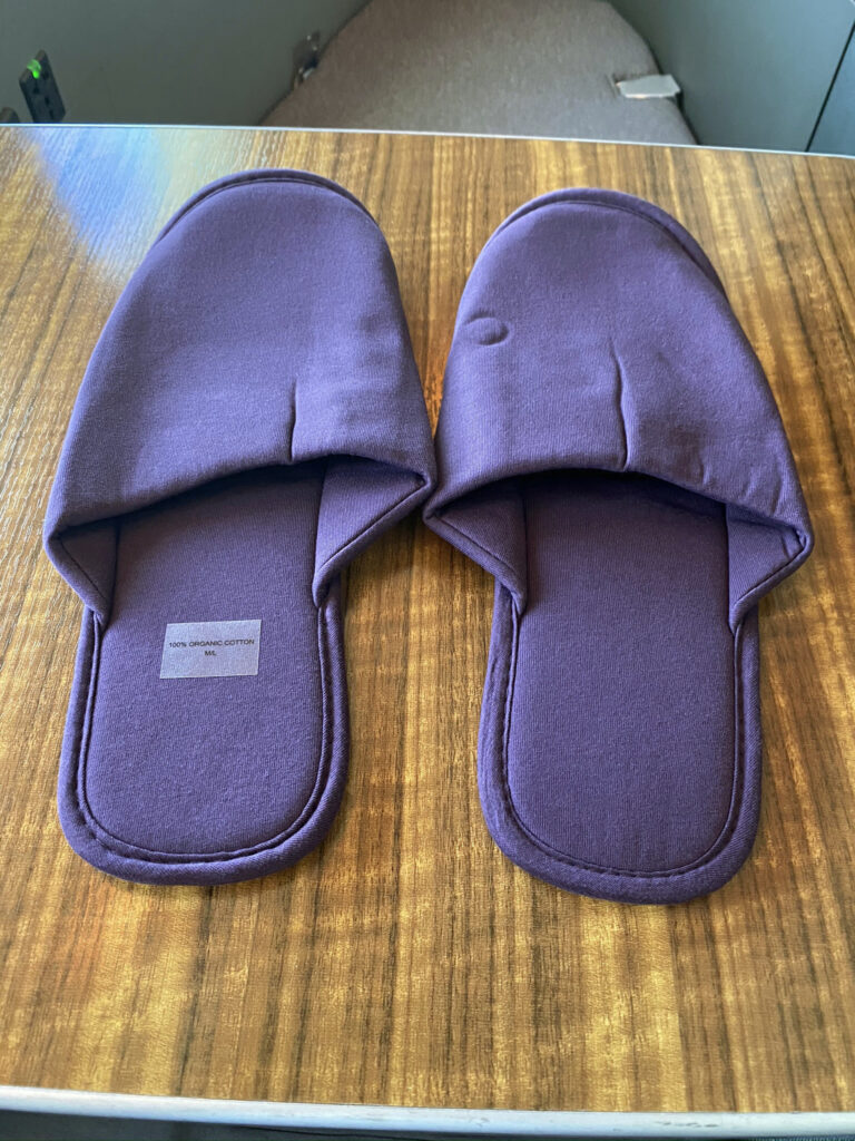 Neben dem Amenity Kit erhalten Gäste der First Class noch Schlappen und einen Schlafanzug. Produzent des qualitativ exzellenten Schlafanzugs ist de Firma PYE. Das Design orientiert sich dabei am Mao Anzug und die Farbe wechselt mehrmals im Jahr. In meinem Fall passte die Farbe des Schlafanzugs zu dem auberginenfarbenen Lederstreifen des Amenity Kits. Die Schlappen sind ebenfalls farblich zum Schlafanzug abgestimmt. Schlafanzug und Schlappen werden in einer versiegelten Stofftasche gereicht, die man ebenfalls behalten und weiterverwenden darf.