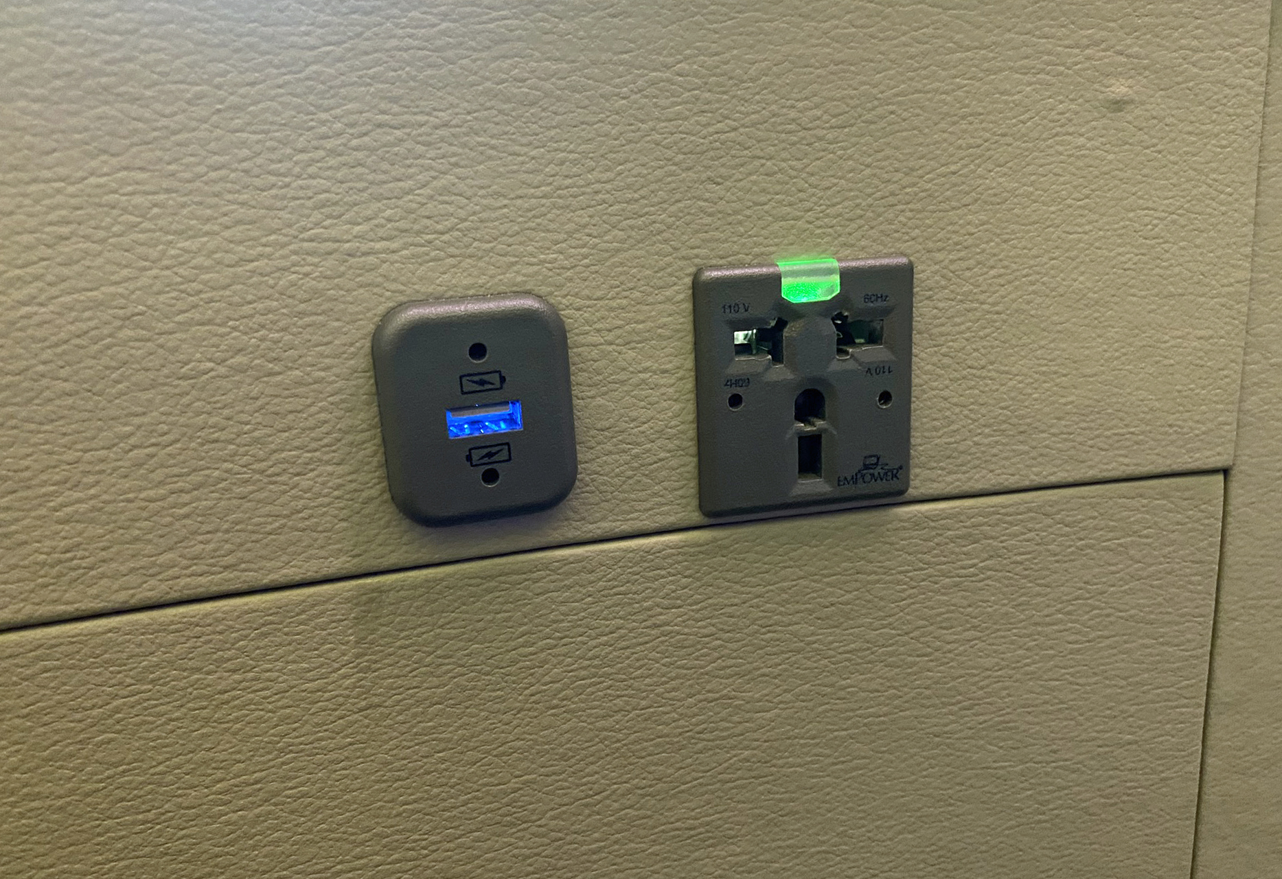 Der Sitz bietet eine 110V Universalsteckdose und zwei USB-Anschlüsse, an denen Geräte geladen werden können. Für mich war das ausreichend.