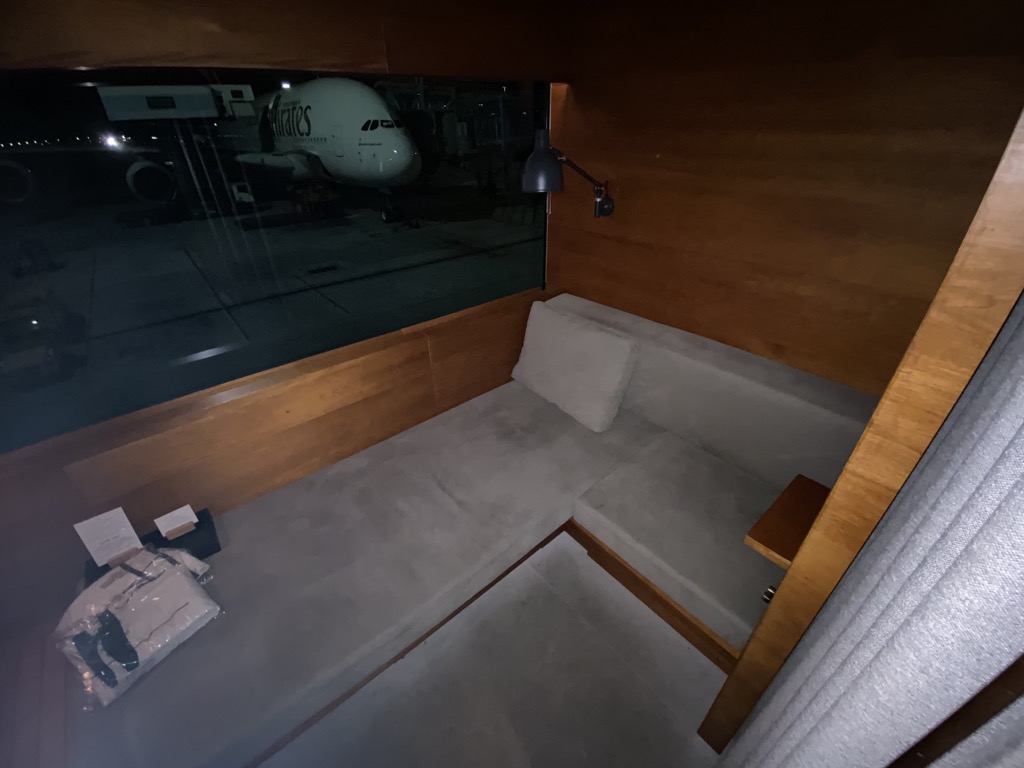 Besonders beeindruckt hat uns hier der Vorfeldblick. Schade fand ich persönlich, dass nur eine ganz dünne Decke gereicht wurde. Die Lounge war sehr gut klimatisiert und ich habe gefroren. Ebenso störend empfanden wir den Geräuschpegel bei den Dayrooms, da sie nur mit einem Vorhang geschlossen sind. Wir haben hier mit hochgelegten Beinen gearbeitet, aber an Schlaf wäre ohne Ohrstöpsel nicht zu denken gewesen.