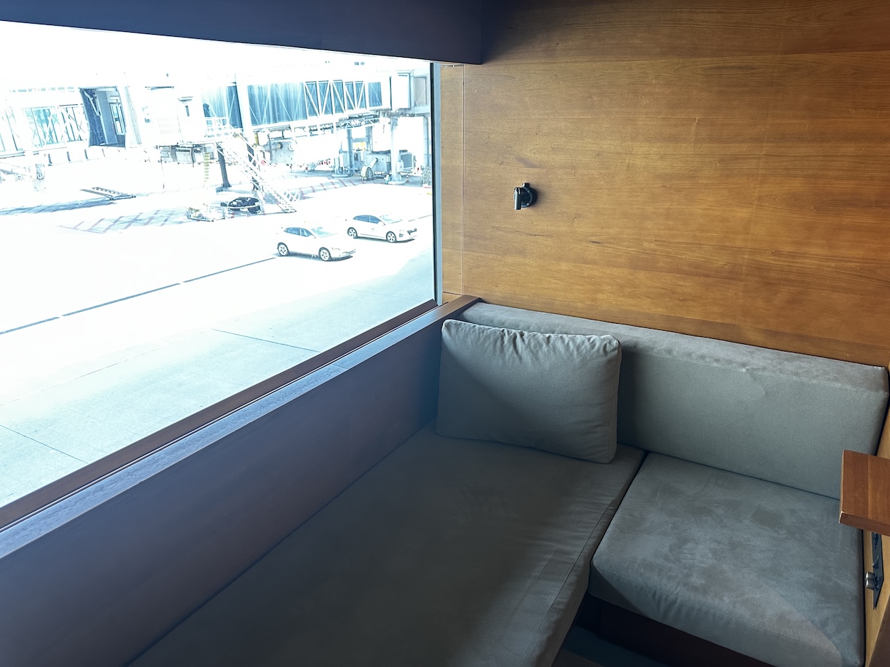 Daneben sind die „Retreat“ Ruheräume, es handelt sich um kleinen Buchten, die mit großen Fenstern versehen sind. Man kann also auf das Vorfeld blicken, wobei es tagsüber dann ziemlich hell werden kann. Die kleinen Räume sind zum Gang hin offen, es gibt nur einen Vorhang. Wenn es dort lauter wird, bekommt man das voll mit.
