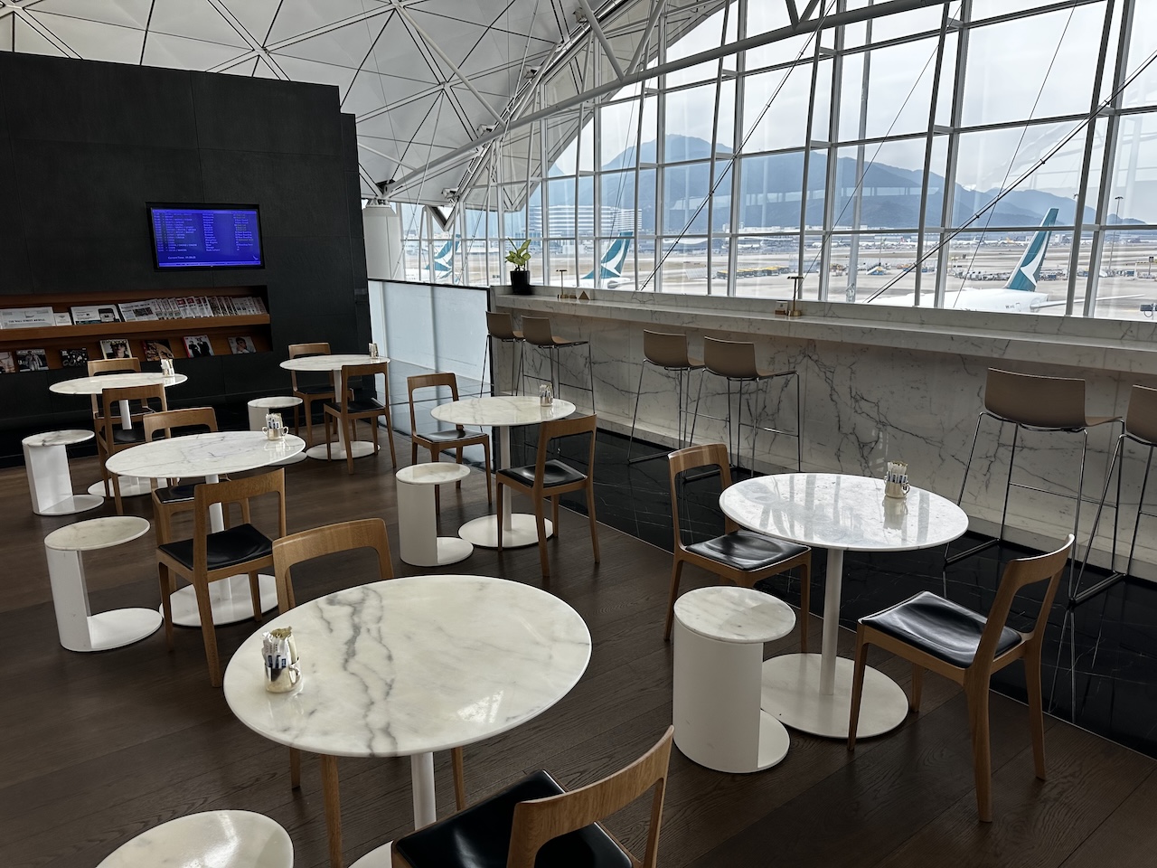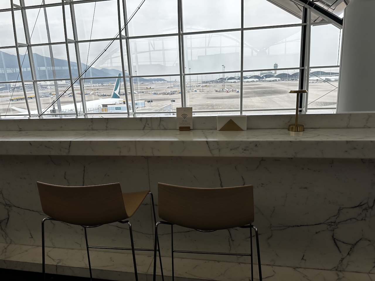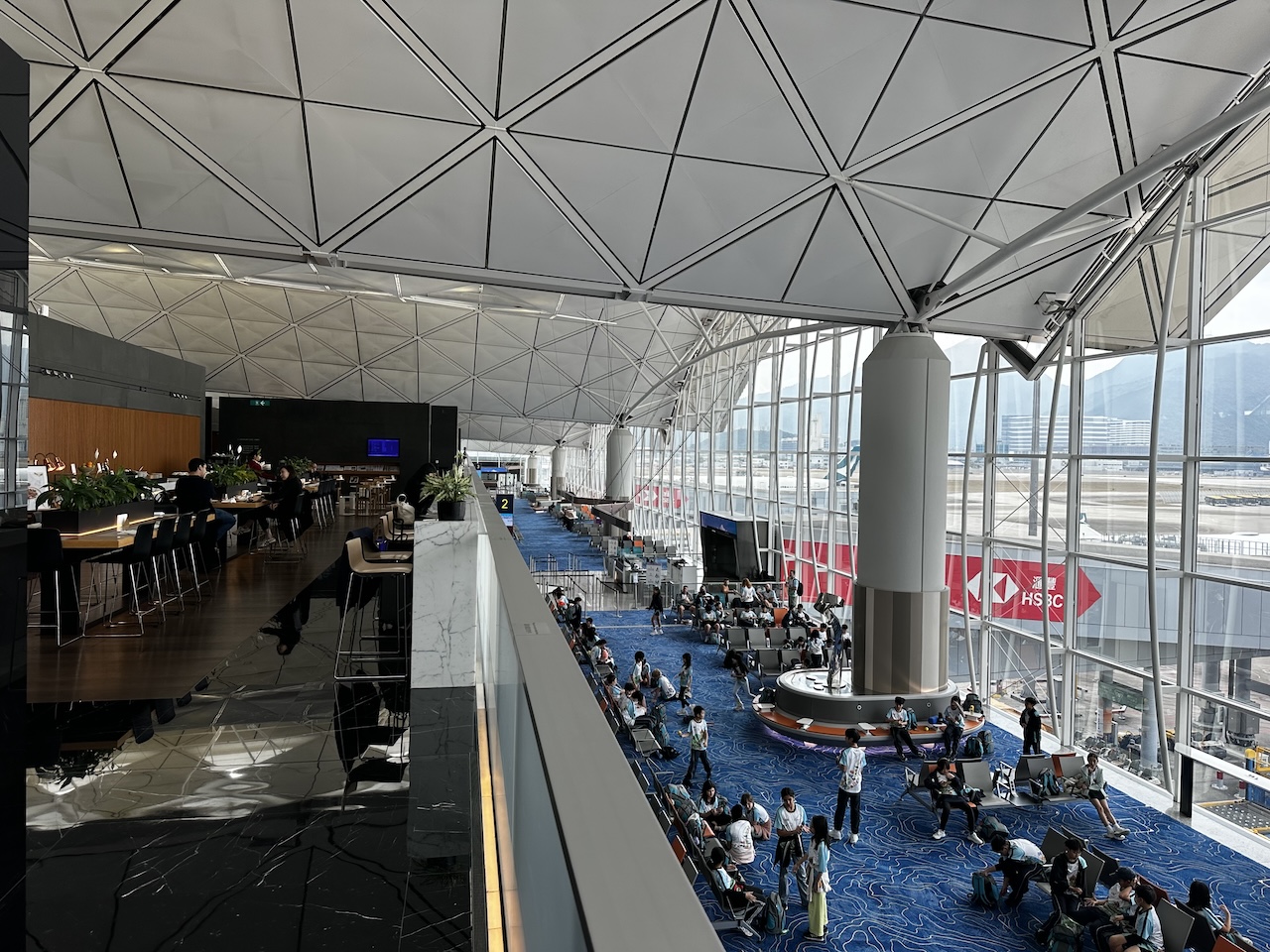 Irgendwie fand ich es zunächst ganz gut etwas von dem Leben im Terminal mitzubekommen, doch irgendwann wurde es dann auch einfach zu viel mit dem Lärm und der Unruhe. Trotzdem hat es mir an jenem Morgen bei Cathay Pacific ganz gut gefallen. Mit einem guten handgemachten Cappuccino, einem Mandelcroissant und Vorfeldblick war der Start in den Tag perfekt, danach noch Champagner und ein Lunch im Restaurant- so ließ es sich aushalten.
