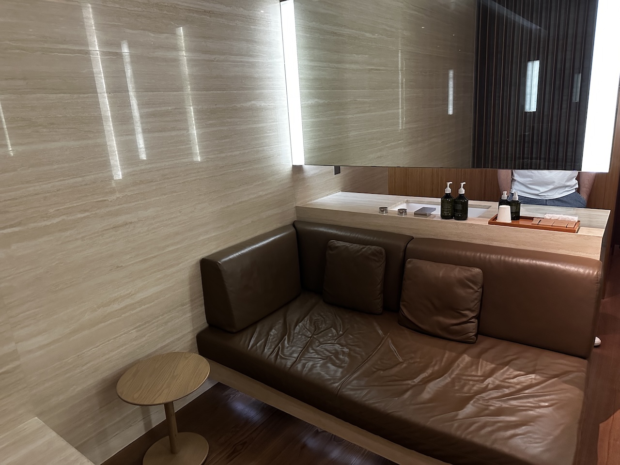 Hier kann man sich also in aller Ruhe vor oder nach einem langen Flug erfrischen. Im Zimmer ist noch ein Sofa und eine eigene Toilette.