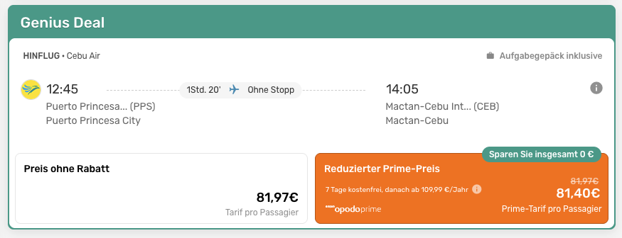 Den Flug von Puerto Princesa (PPS) nach Cebu (CEB) habe ich online bei Opodo gebucht. Dort konnte ich „Premium Economy“ als Klasse auswählen, obwohl Cebu diese gar nicht anbietet. Herausgekommen ist dann ein Tarif inklusive Aufgabegepäck für gute 80 Euro.