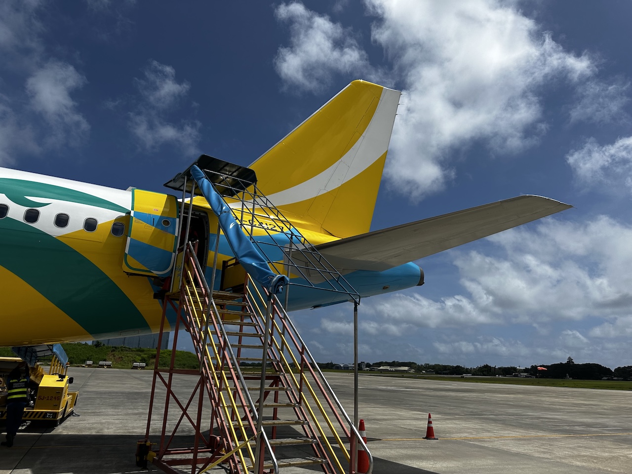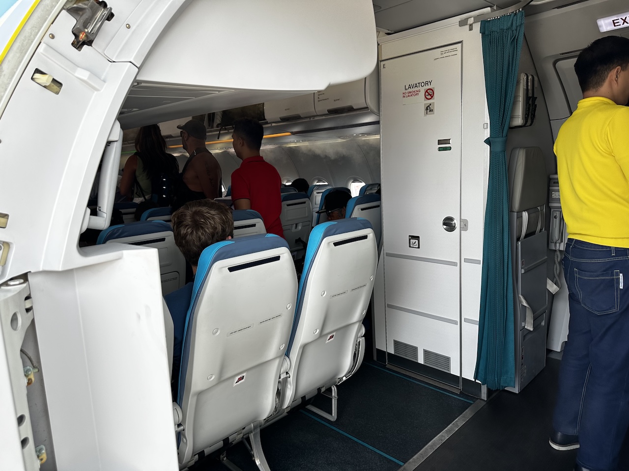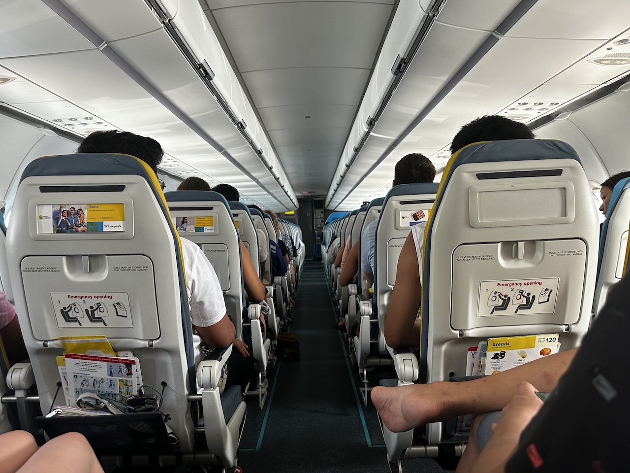 Dadurch dass es in Puerto Princesa keine Fluggastbrücken gibt, konnten die Fluggäste vorne und hinten durch Rampen einsteigen. Ich habe die hintere Tür genommen und gleich erkennen können, wie dicht die Maschine bestuhlt ist. Die letzte Sitzreihe ragte bis zum Eingang, es wurde kein Platz für eine Trennwand verschenkt.