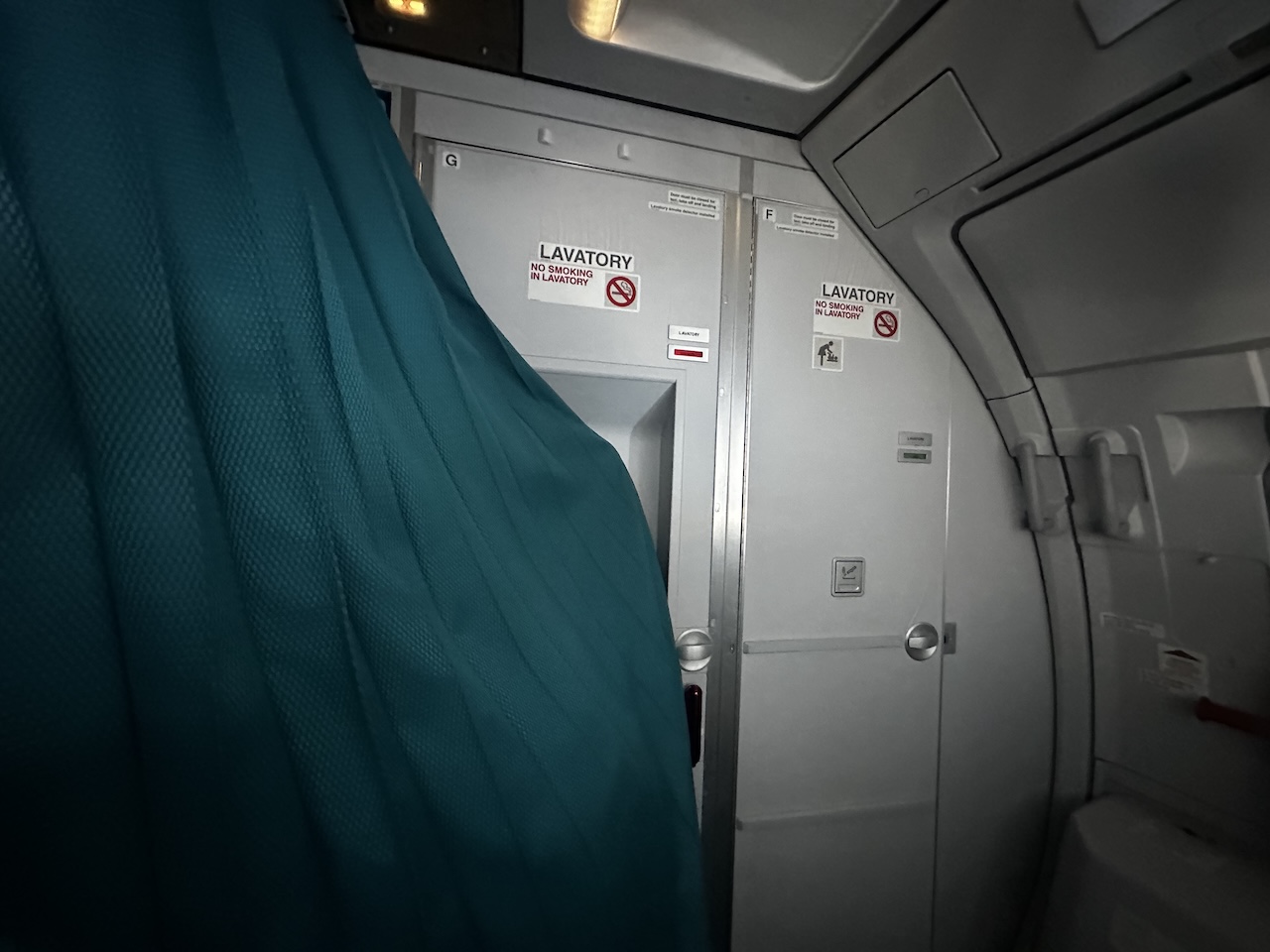 Mit 236 Sitzen sind über 20 Plätze mehr als bei der Lufthansa verbaut, Cebu hat dennoch drei Waschräume in den hinteren Bereich installiert. Dafür ist die Galley etwas kleiner geraten, die Crew hat sich hier während des Fluges aufgehalten und den Bereich mit einem Vorhang abgetrennt, wobei eine der Toiletten damit nicht mehr benutzbar war. Auf dem kurzen Flug aber überhaupt kein Problem.