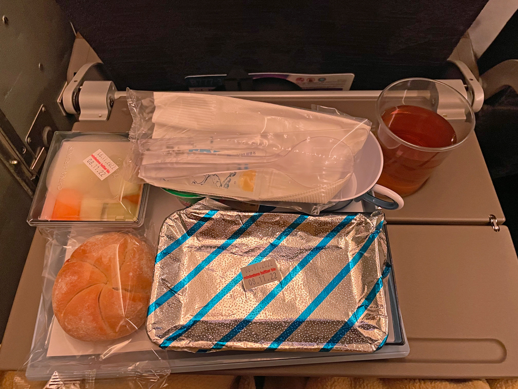 Dass die erste Mahlzeit bereits 40 Minuten nach dem Start bei mir war fand ich sehr gut, denn auf den Flügen Richtung Asien die mittags in Deutschland starten, ist das mit dem Schlaf so eine Sache. Und erst ewig aufs Essen zu warten macht es nicht besser. Auch dass das Tablett zügig abgeräumt wurde – wobei es noch eine zweite Getränkerunde gab, ist angenehm.