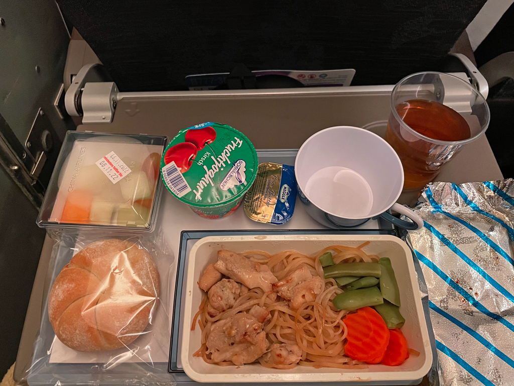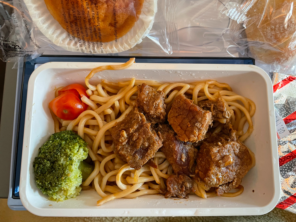 Bei der ersten Mahlzeit gab es in der Economy Class zwei Optionen: Nudeln mit Rindfleisch oder Reis mit Hühnchen. Eine vegane oder vegetarische Option wurde nicht aktiv angeboten. Allerdings hätte man Sonderessen vorbestellen können.