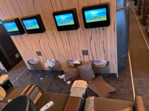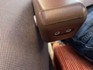 Am Monitor selbst befindet sich ein USB-C Port. Die Kopfhörerbuchse befindet sich in der Armlehne. Das ist gewöhnungsbedürftig. Der Gedanke war vermutlich, den Weg zum Gang nicht durch Kopfhörerkabel zu versperren. Aber in der Praxis eines Economy Class Flugs spielt das faktisch keine Rolle. Ganz im Gegenteil. Man könnte irrtümlich denken, dass es sicher wäre, den Kopfhörer eingesteckt zu lassen, wenn jemand aus der Reihe sich zum Gang bewegt oder von dort wiederkommt. Diese Naivität hat mich einen meiner Adapter (2 Zapfen auf einen Zapfen) gekostet.