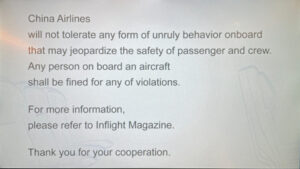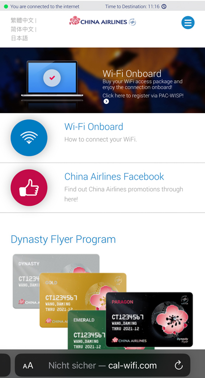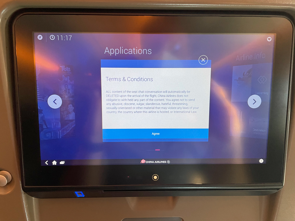 China Airlines bietet den Passagieren auch einen Chatprogramm an. Dann kann man kreuz und quer durchs Flugzeug mit anderen Reisenden in Kontakt treten. Verpflichtet sich aber auch, gegen kein Gesetz und keine Sitte, die irgendwo auf der Welt gelten könnte zu verstoßen.