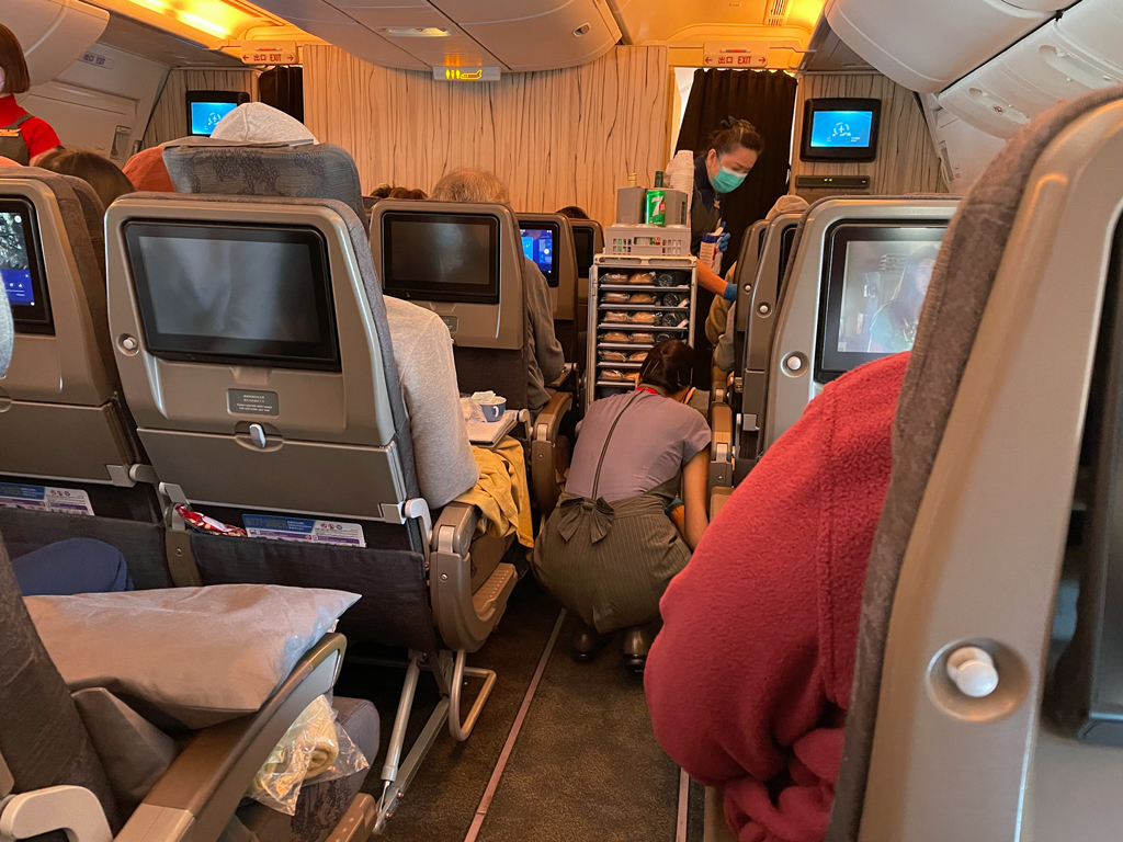 Während der „Schlafphase“ des Flugs verteilte die Crew aktiv Wasser an die wachen Passagiere. Auch wurden die Toiletten stets sauber gehalten. Sogar die weltberühmten Dreiecke wurden immer wieder ins Toilettenpapier gefaltet. Was auf den Toiletten unter Umständen etwas gewöhnungsbedürftig ist, ist die Klaviermusik, die man dort hört.