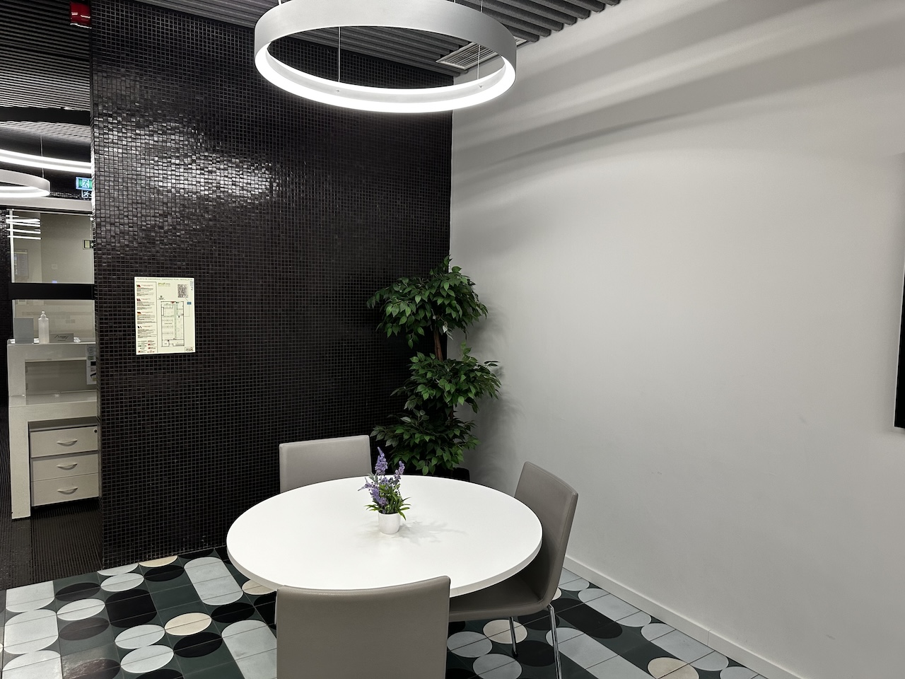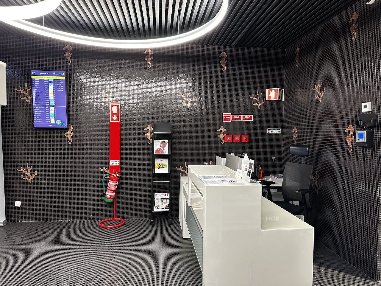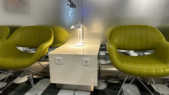 Die Lounge besteht aus einem einzigen Raum, am Eingang befindet sich die Rezeption.
